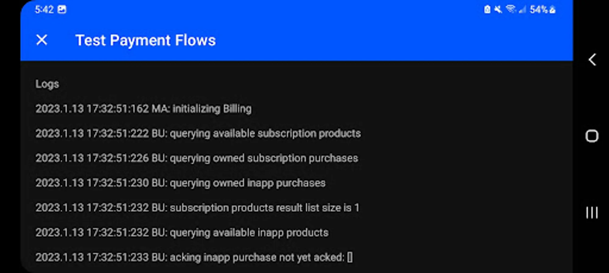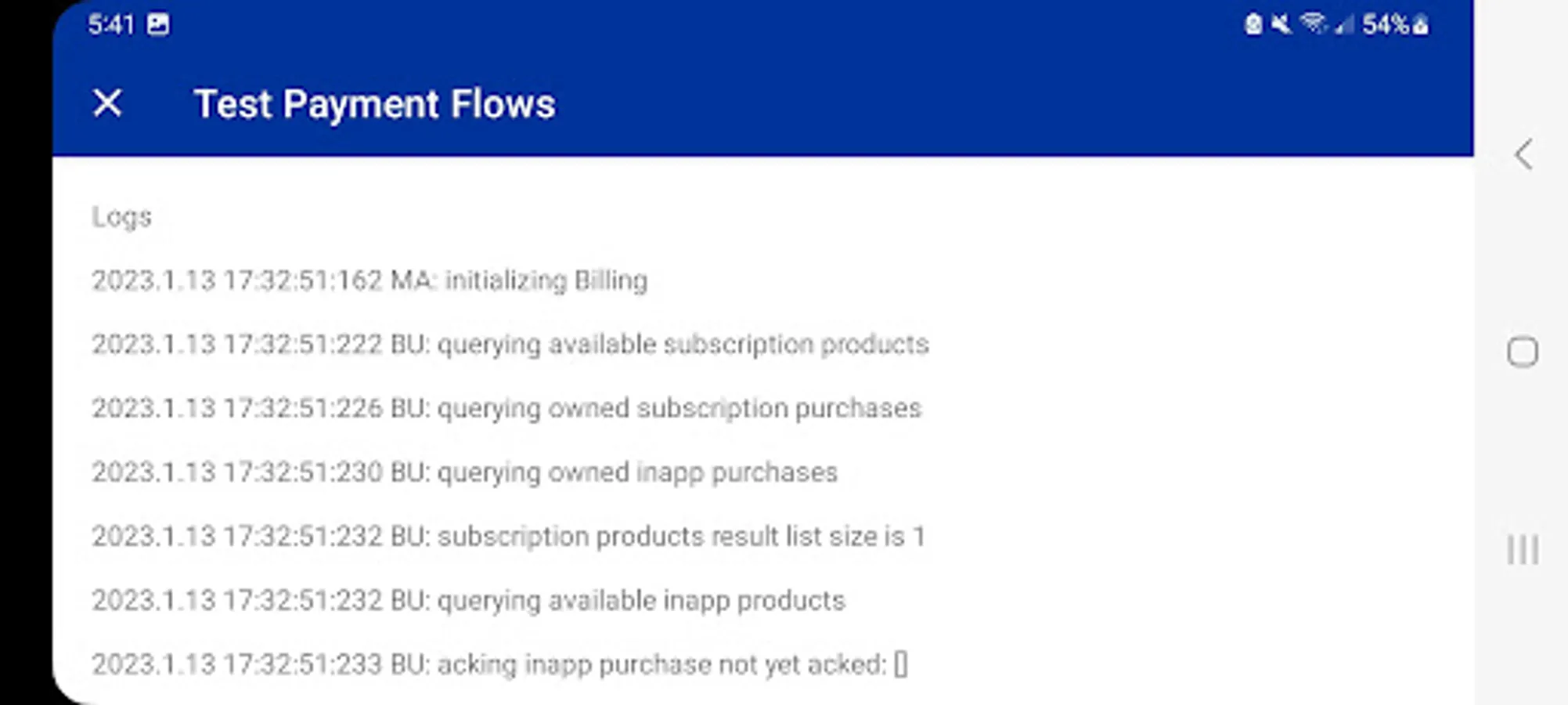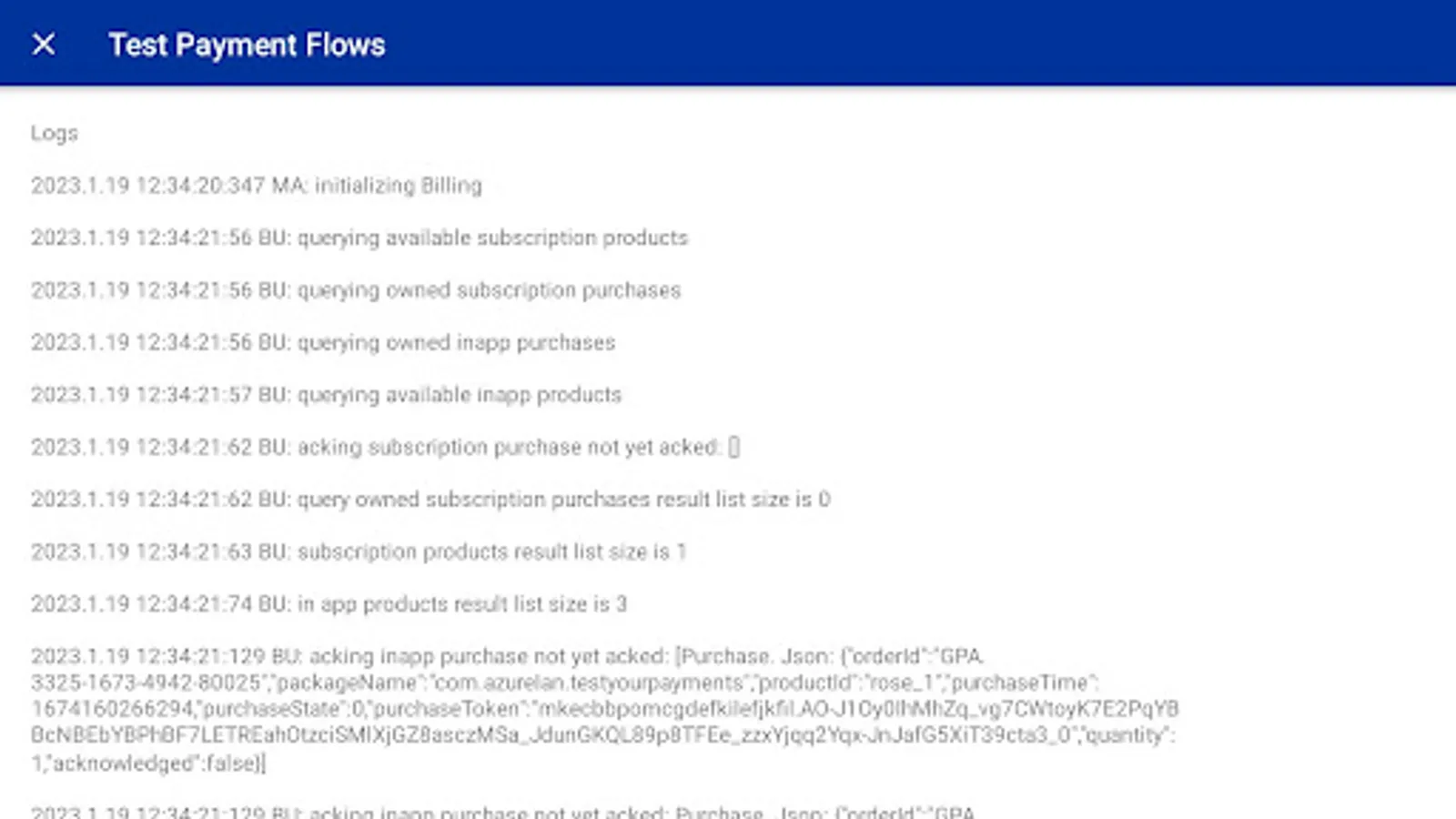Simple app to test and log in-app purchase flow events, built following standard billing practices for apps that do not run their own billing server (that is, relying on Play Billing on-device APIs to query products and purchases).
