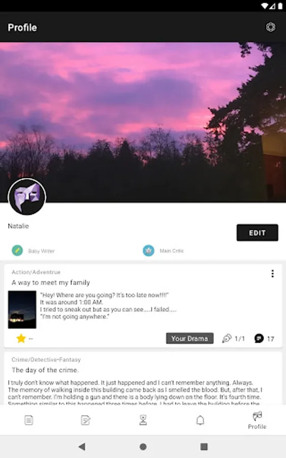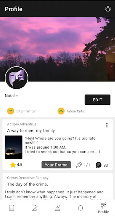 You can change your profile image and background image. By joining Drama Writer, you have begun two careers: writer and critic. Writer and Critic is categorized into intern, baby, assistant, main, and renowned. When you satisfy the goal for the level up, the pop up notification will let you know. You can also see the list of your dramas in Profile tab.