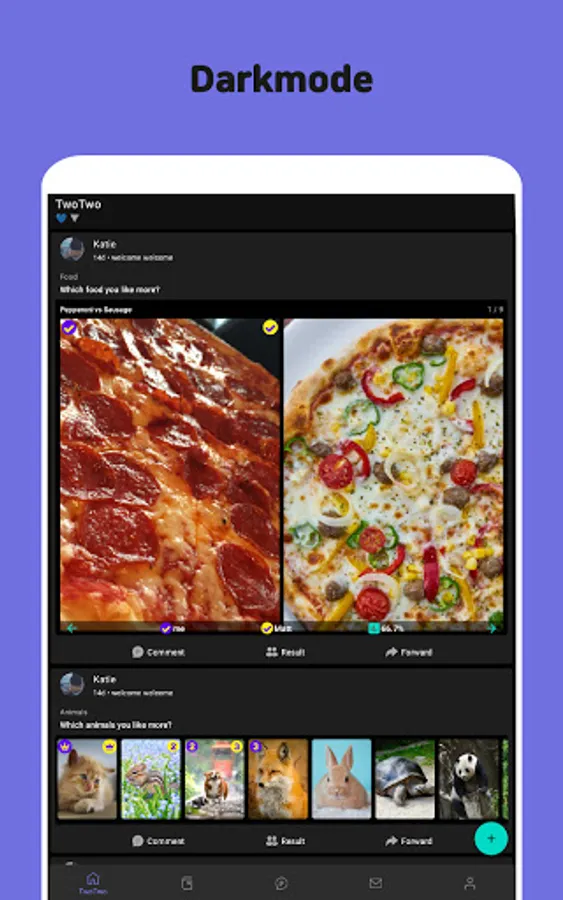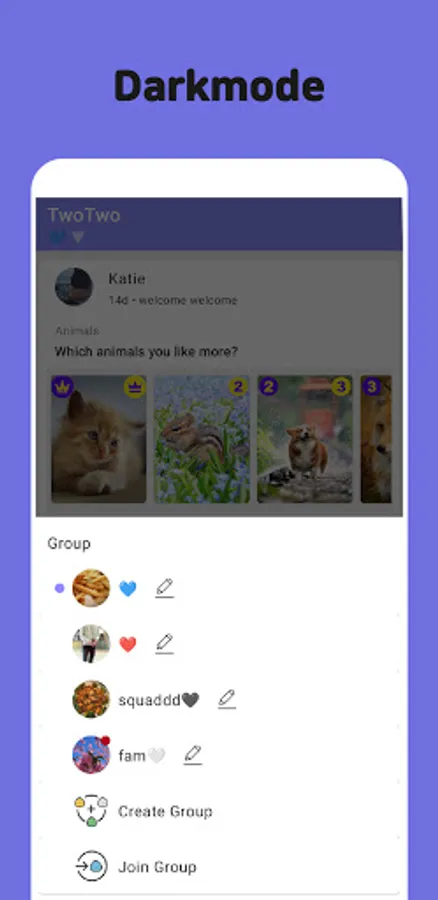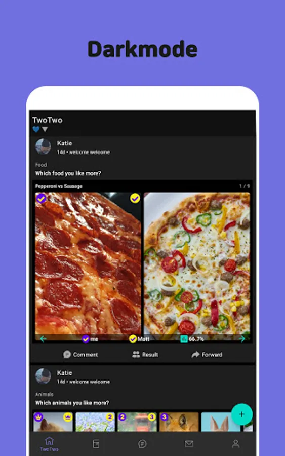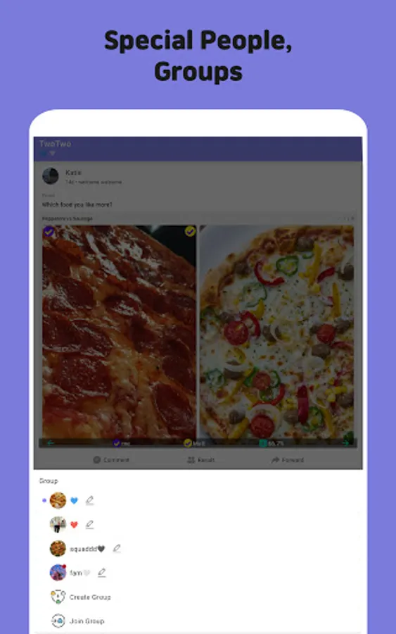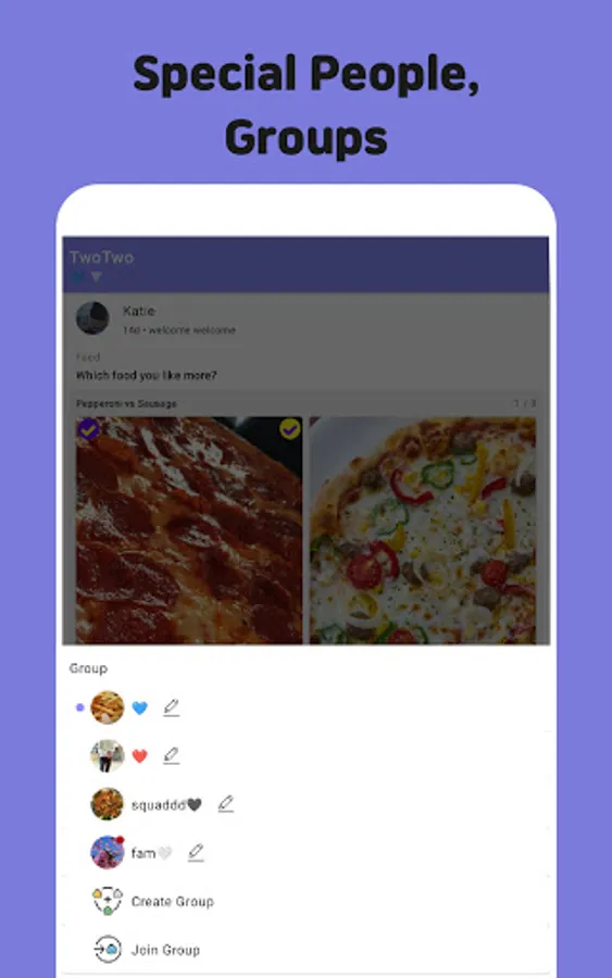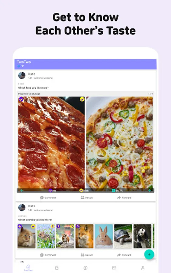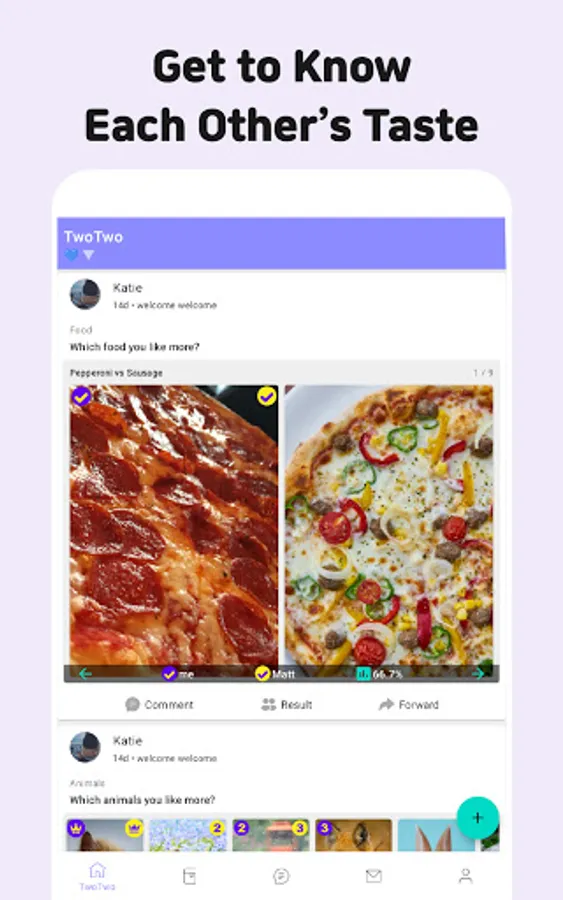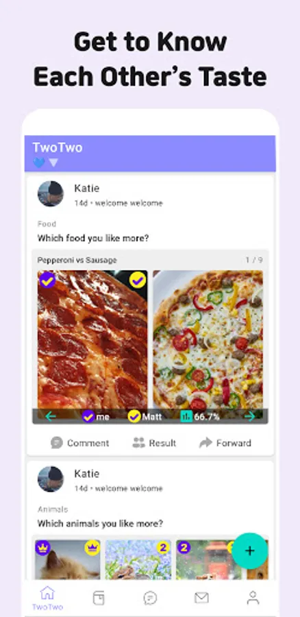 TwoTwo is an app where you communicate with special people(boyfriend, girlfriend, crush, best friends, families, etc) and compare taste, thinking, and personality with them. Get close with them more by joining TwoTwo! Figure out what food they prefer and what they want for their birthday gift. It's also great to use when there is something going on between.