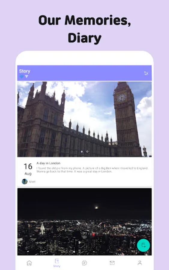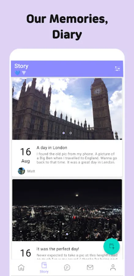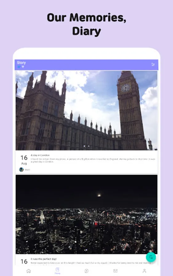 Upload your story and share your daily life and/or thinking. You also can upload an images. It can be a friendship diary with best friend or love diary with a beloved person. It's perfect to be used with family, too. Record precious and good memories about dates, hang out, anniversary, birthday, etc.