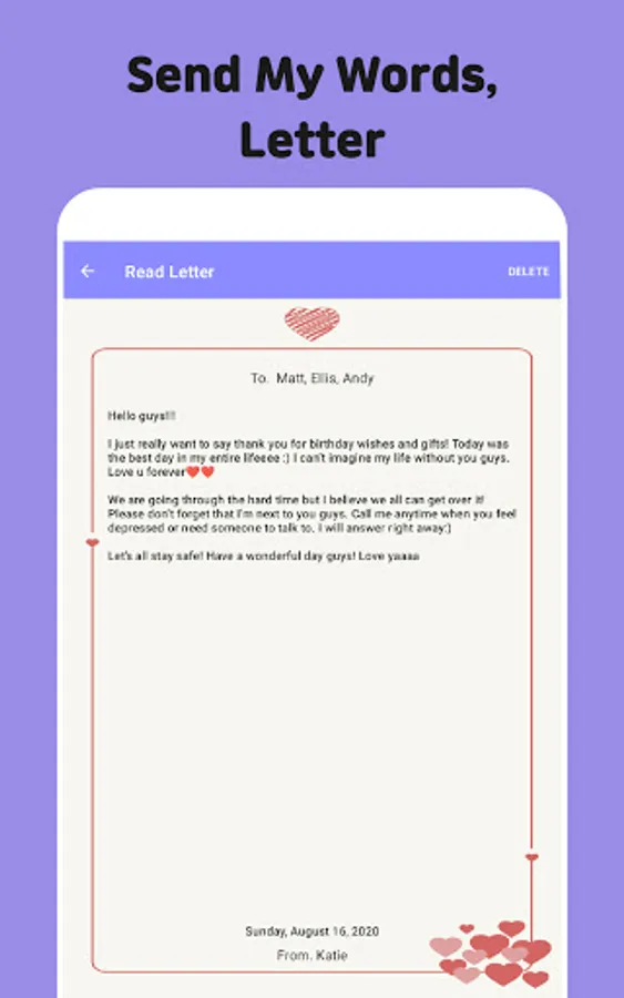 You can send a letters to people. Select multiple members or just one member to send letters with a love. Write beautiful words you couldn't say to them.