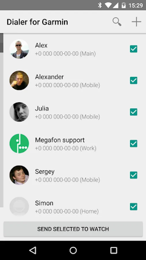 3. Run the application on the watch, then run the application on your phone (making sure that at this moment the watch is connected to your phone). Select the desired contact from the list and send them to the watch pressing the "send selected to watch", contacts will appear in the application on the watch.