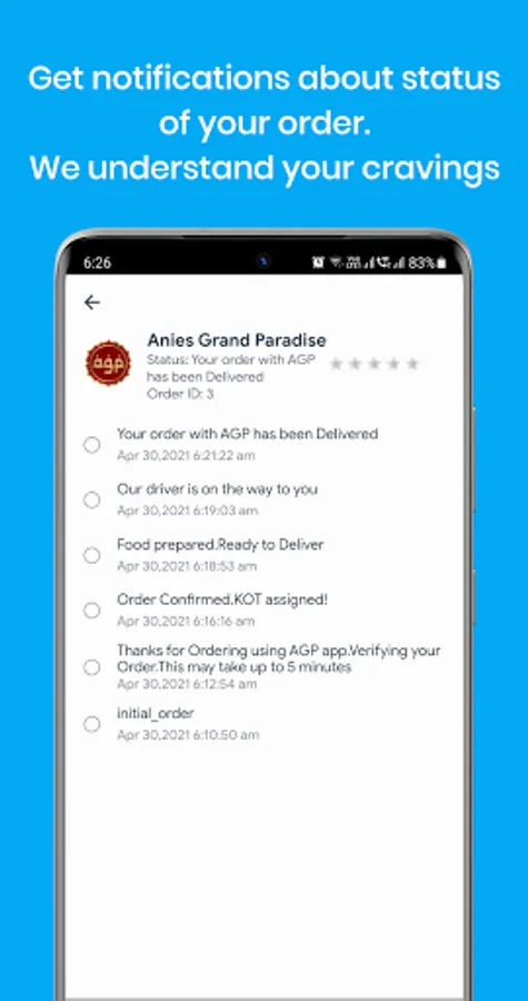 Get food delivery to your doorstep from the best restaurant in the city "ANIES GRAND PARADISE". Find the food you crave and order food from our restaurants easily with the AGP app. Get Realtime Notifications of your order.