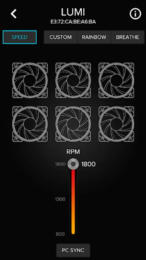 SPEED: Lets you control the fan speeds of the 6 connected fans. The “PC SYNC” button is for toggling control of the fan speed between the LUMI mobile app and you PC’s PWM.