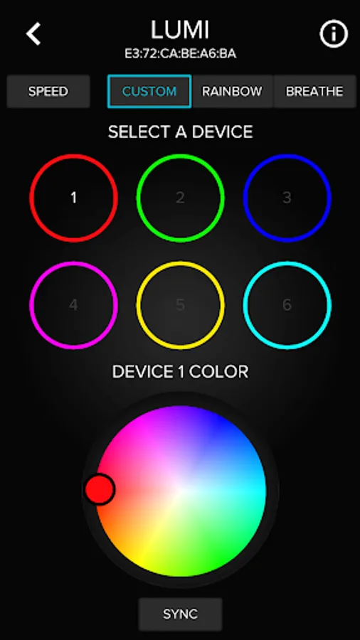 CUSTOM: Allows you to designate a single solid color for up to 6 individual devices. You can set 6 different colors for 6 different devices, or you can select a single color and apply it to all 6 devices by pressing the “SYNC” button.