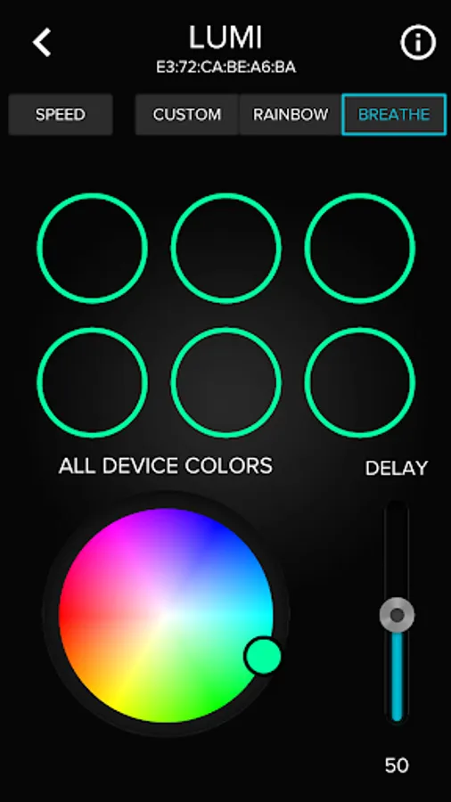 BREATHE: In this mode, you can apply a breathing light pattern to all connected devices. Select the color using the color wheel, and select the transition speed using the “Delay” slider.