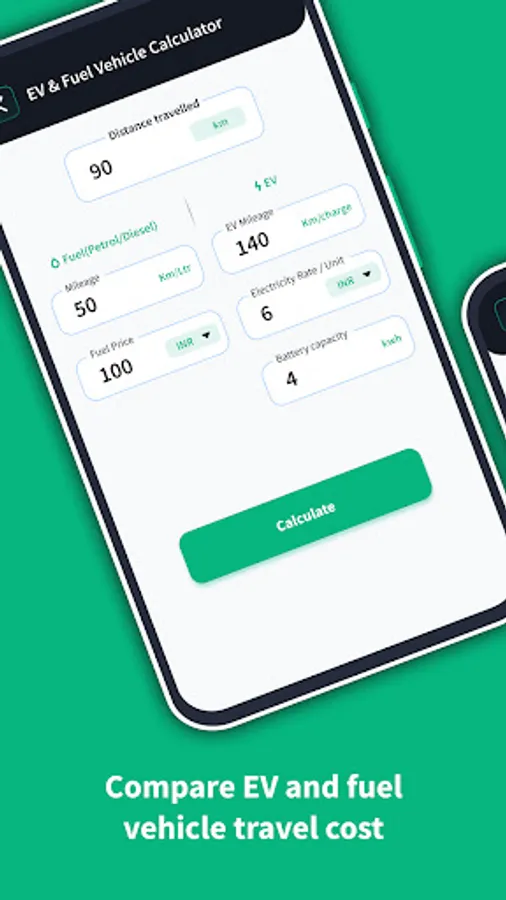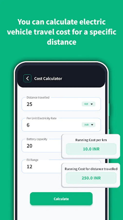 1. Cost Calculator : Calculate the cost of your distance travelled. Enter the distance travelled in km/mile, enter per unit electricity rate in INR/USD, enter your battery capacity in KWHa and enter EV mileage in km per charge.