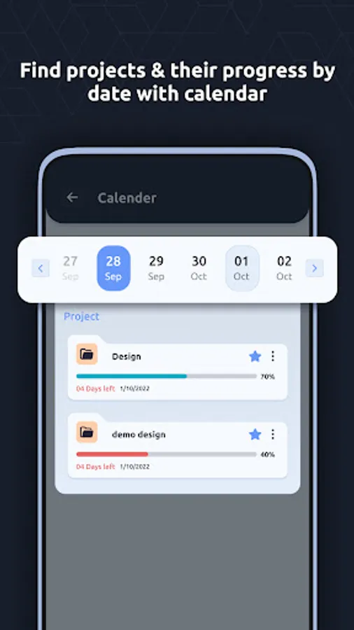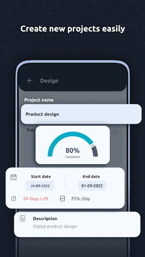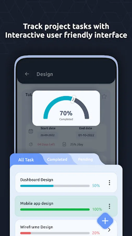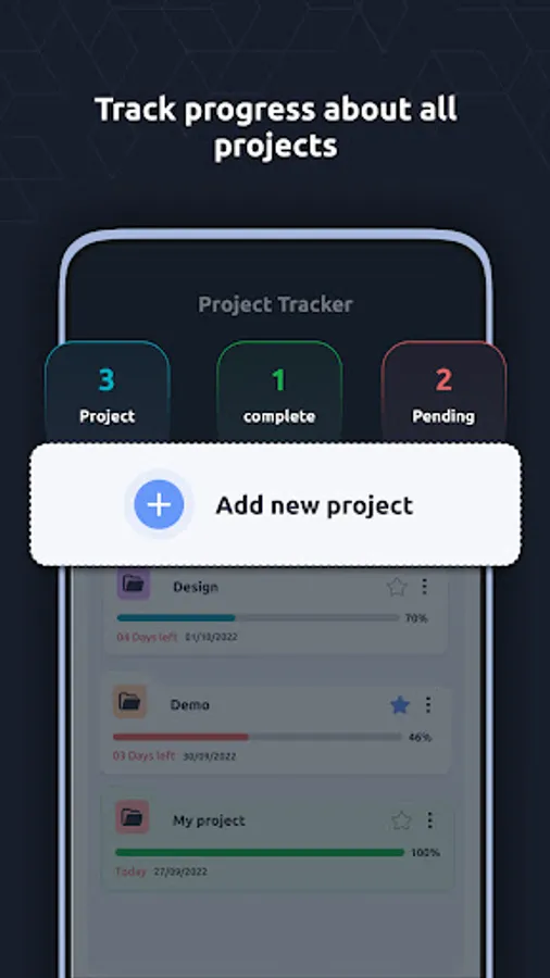- Progess tracker will update you on how many days are left to complete this project & deadline tracker will suggest you how much percent of work should complete in 1 day to achieve your deadline.
