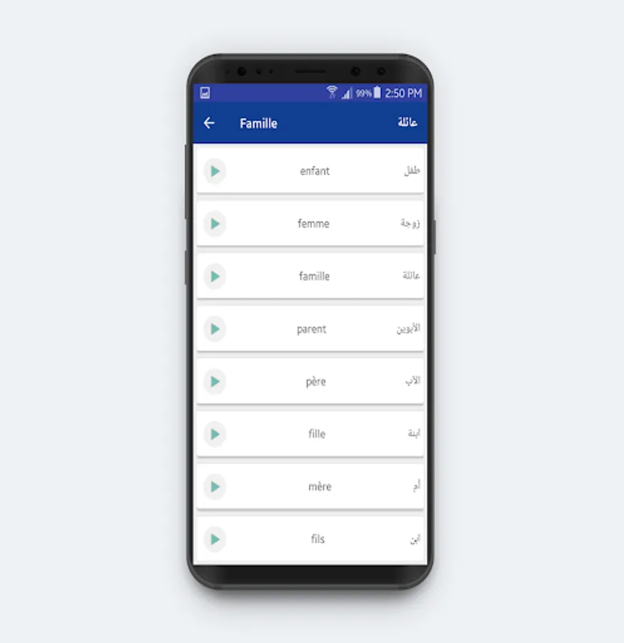 And the beautiful thing about the application is that it works without internet and its space on the phone is very small, compared with what it contains of information, rules and lessons in the French language