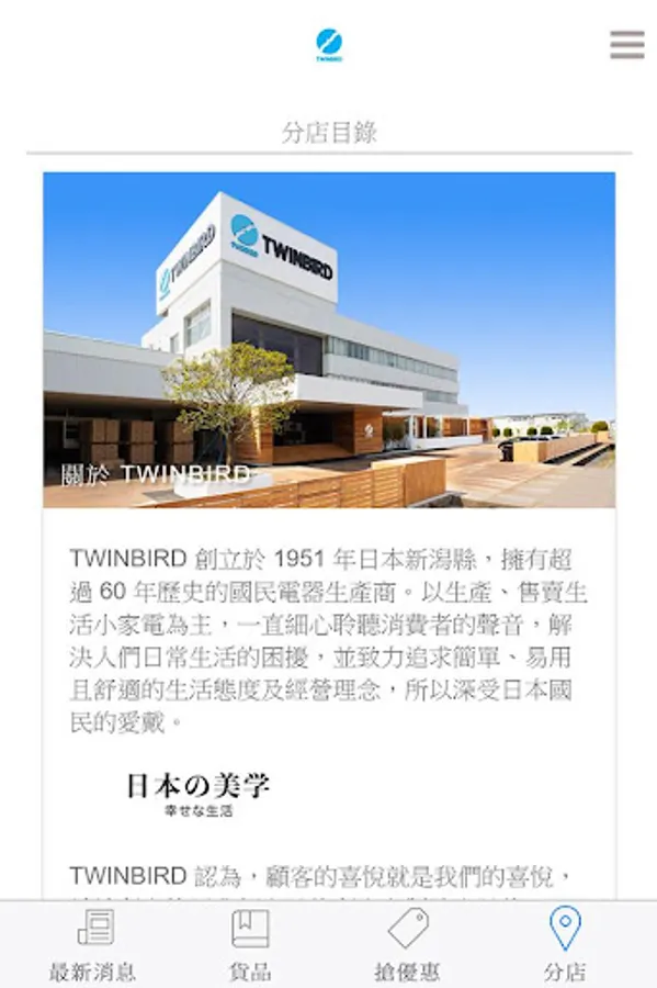 Twinbird 創立於 1951 年日本新潟縣,擁有超過 60 年歷史的國民電器生產商。以生產、售賣生活小家電為主,一直細心聆聽消費者的聲音,解決人們日常生活的困擾,並致力追求簡單、易用且舒適的生活態度及經營理念,所以深受日本國民的愛戴。