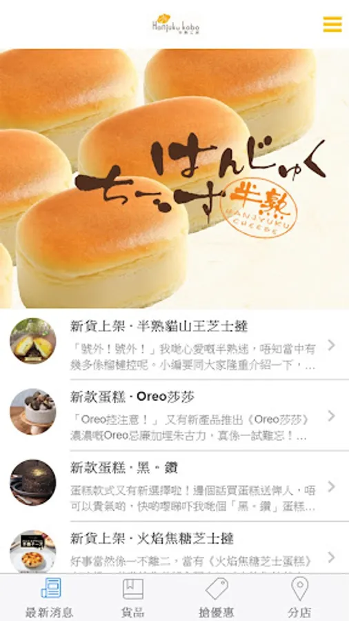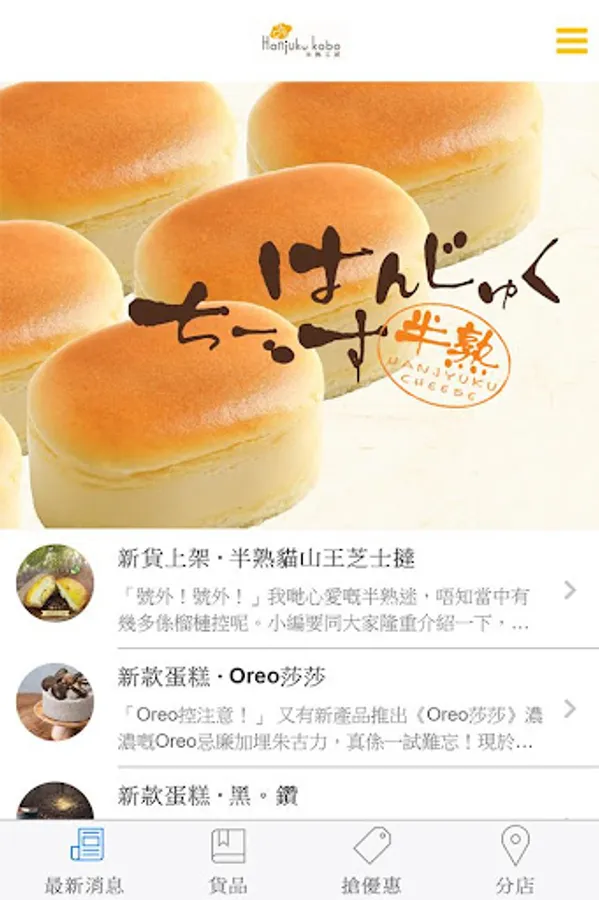 全新半熟工房手機應用程式集會員卡、網上訂購、資訊及優惠於一身。立即下載Hanjuku Kobo Mobile-App, 專享會員優惠。讓你享受最新推廣優惠及隨時隨地輕鬆訂購半熟工房多款熱賣產品。