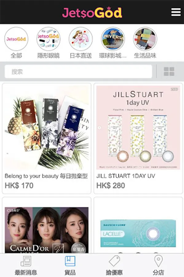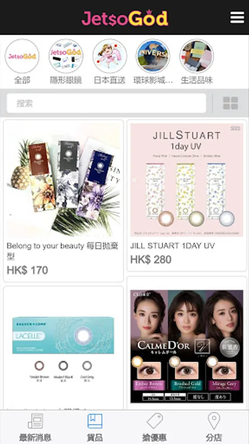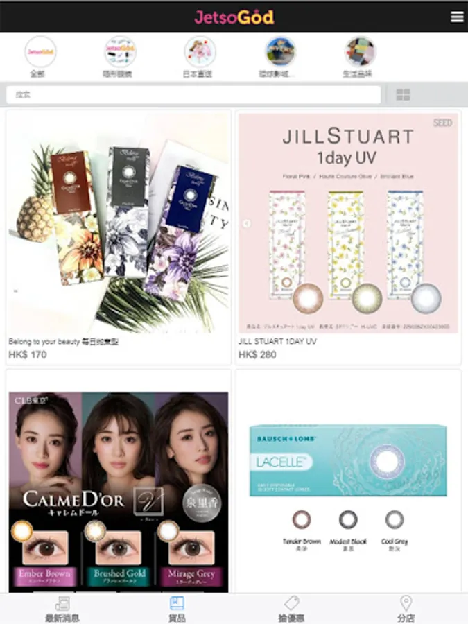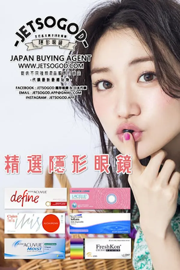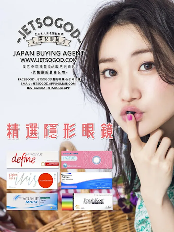 JetsoGod 是一間致力為大家提供及搜羅各不同種類的貨品及服務的商店:本店現主打各大牌子原廠正貨隱形眼鏡:Johsnon Acuvue , Bausch & LombAlcon Focus , Air Optix , FreshlookCooper Vision : Pro Clear , BioMedics, UltraFlexFreshkon , Delgiht , Fairy , Clalen , Seed ,ANN365 , Candy Magic , Calme D'or , Victoria