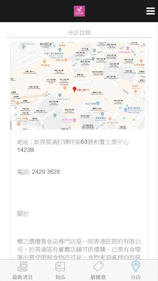 櫻之選優質食品專門店是一間香港註冊的有限公司,於葵涌區工業大廈有實體店鋪可供選購食品。 本店已申領食環署各認可的許可証,食品來源,處理均有保証。 本店致力為大家搜羅各地的優質食材,提供優質的食品。 全店食品買滿$500免費冷凍運輸送貨,確保食品良好的質素 。