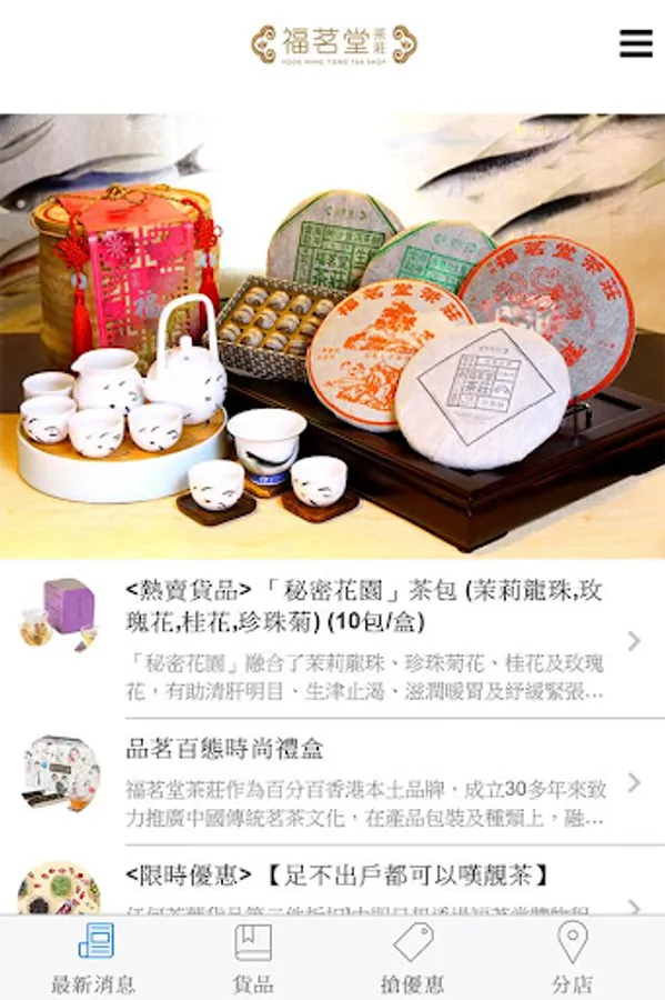 透過福茗堂手機程式,讓你更了解茶知識之餘,更讓你隨時隨地,選購你喜歡的中國茶葉、茶包及送禮佳品!此外,登記資料,每次消費,可記錄積分。憑指定消費額可升級成為會員,及以指定積分兌換限量禮品,亦可發掘最新優惠及資訊,享盡優惠及方便。