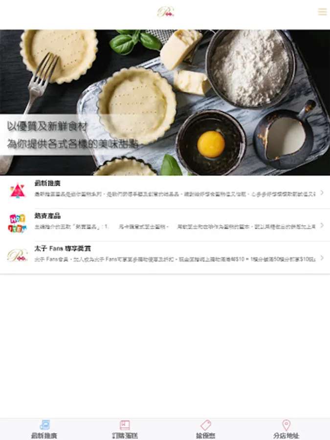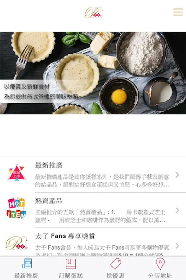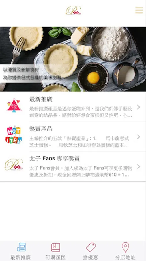 透過全新太子餅店手機應用程式APP,滙集網上訂購、資訊及優惠於一身,並享有積分儲存優惠。立即下載,接收最新產品資訊和享受特別折扣優惠,隨時隨地訂購多款熱賣蛋糕、西餅,及其他產品,方便又貼心。