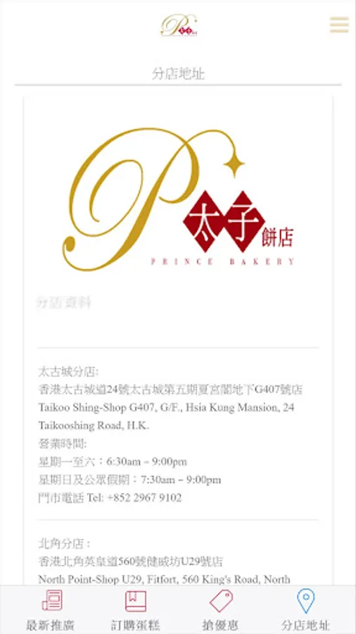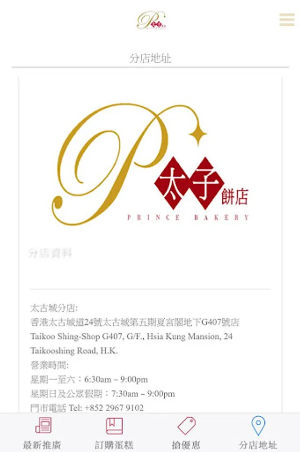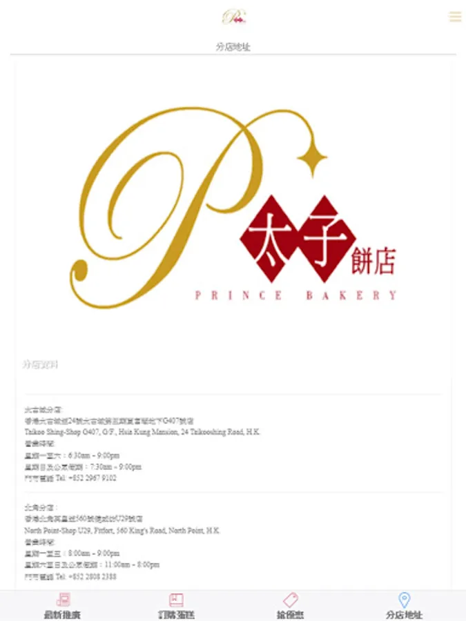 - 店舖位置:搜尋或定位搜尋附近太子餅店分店資料、營業時間及瀏覽有關分店詳情。