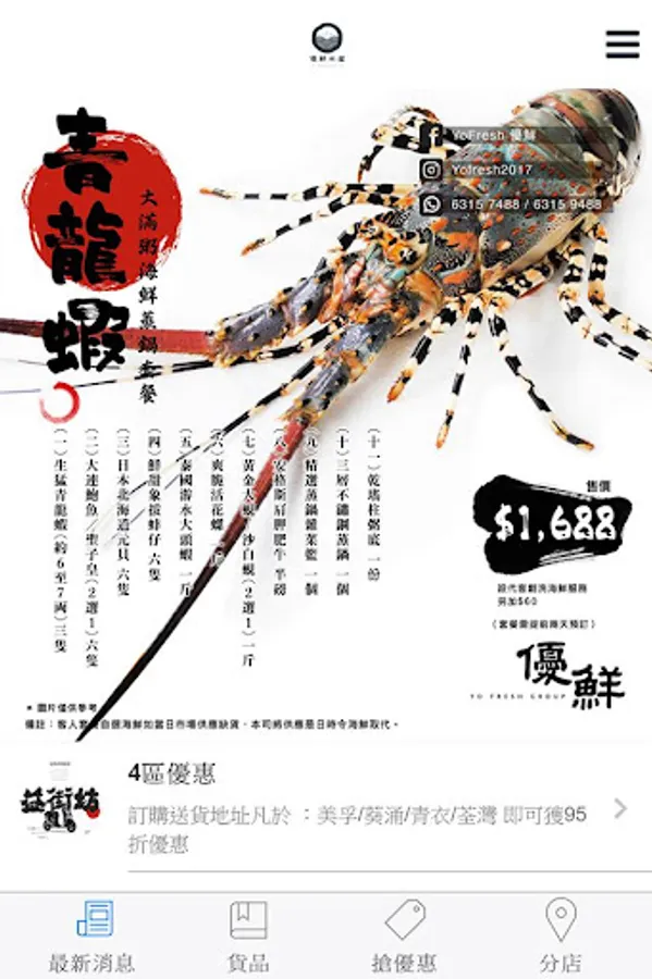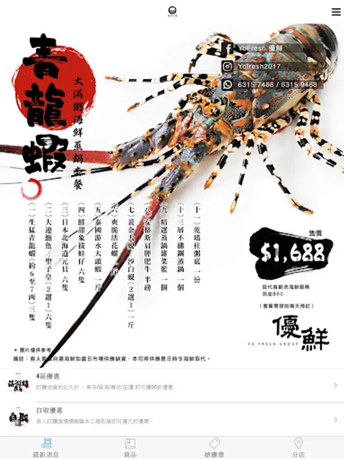 Yofresh優鮮於2017年成立。主理人之一家族四代為香港本地漁民世家,具有豐富海鮮知識。科技日新月異,選購新鮮海鮮同世界各地高質食材不再是從前那樣子,需要親身到街市同人迫住選購。新世代只需要手機在手,一個APP就能讓你輕鬆選購到世界各地優質海鮮食材,選購確認後,為客人指定日期送到府上及指定目的地。本店是一間設有食物製造廠牌照的網上海鮮食材商店,成立的宗旨是希望為各食客做到既方便之餘,又可以合理價錢在家品嚐到最新鮮的環球海鮮食材。海鮮食材每日由團隊到香港仔批發漁市場取貨,將最新鮮的海鮮帶比食客。本店主力打做一條龍服務,提供多款不同類型套餐選購(有火鍋、蒸鍋、BBQ、熟食到會、雞煲等)讓客人安在家中都可品嚐多款不同海鮮美食。本店更設有代客劏洗海鮮、蒸煮海鮮服務,令客人更方便暢快地享用到美味海鮮。各客人收貨後可按照本店建議的蒸煮時間烹調,只需數十分鐘,一頓豐富又鮮味的海鮮大餐就呈現在大家眼前,餘下落黎,當然是享受美食的時間啦。