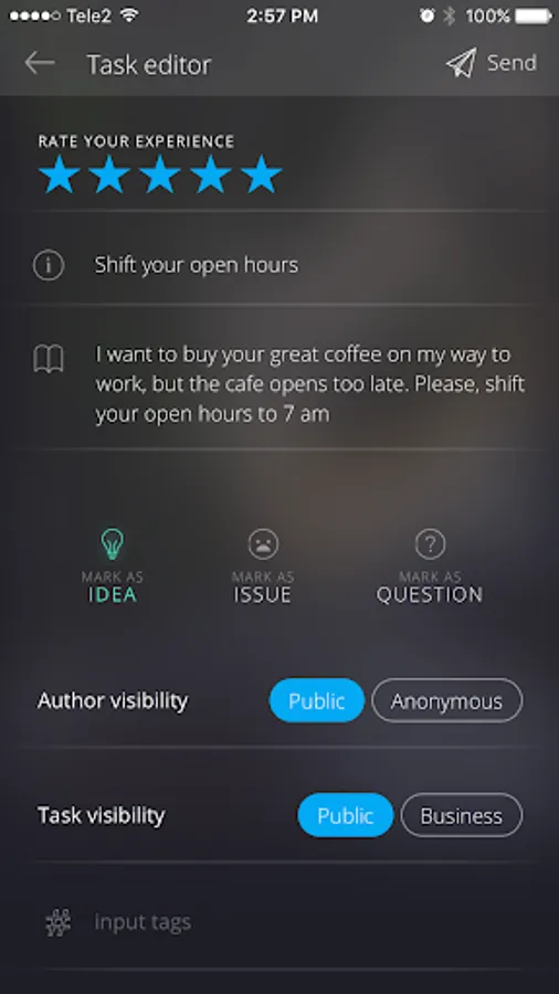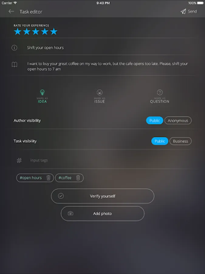 - Write your task directly to business and mark it as an idea, issue, question or just write about your experience and rate it.