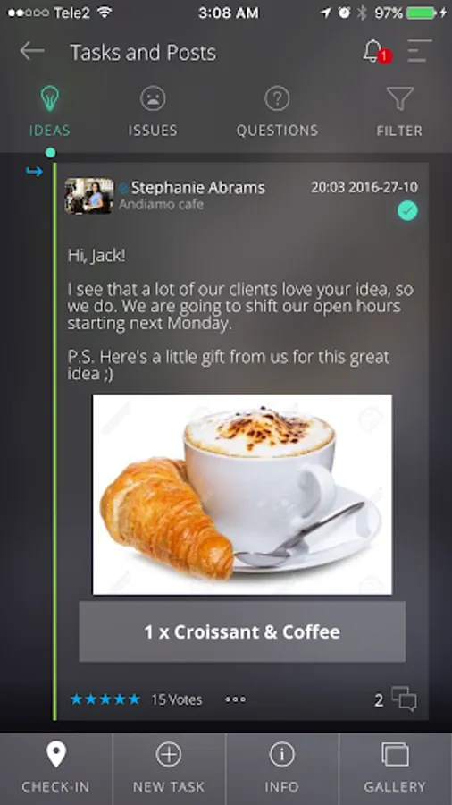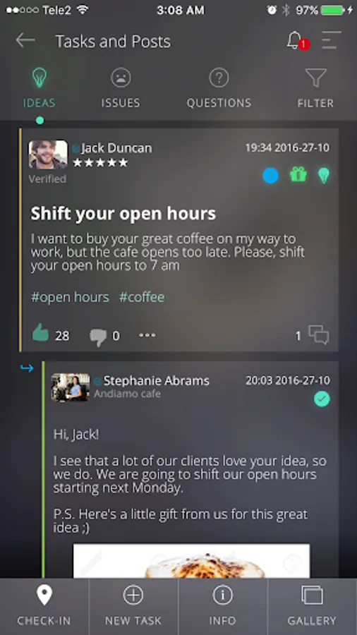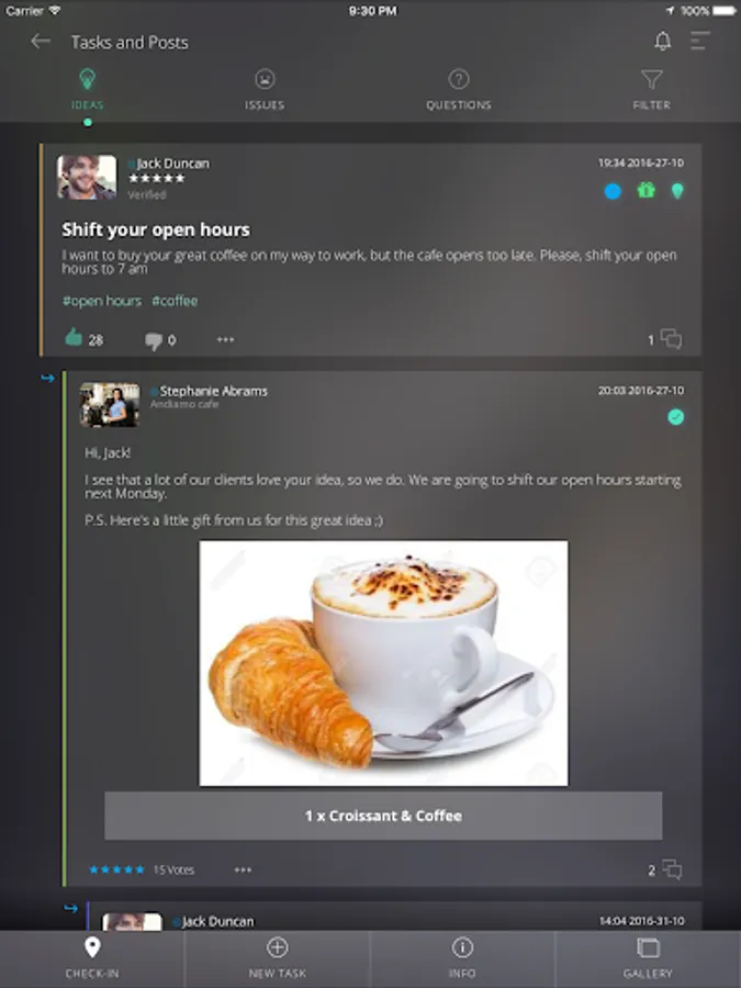 You can create tasks for a local business, for example, "I want to buy your great coffee on my way to work, but the cafe opens too late. Please, shift your open hours to 7 am". Other clients can vote for the task. Business can offer a solution, thank you for this idea and give a gift. Anyone can rate this solution. So business rating depends on how they treat their clients.