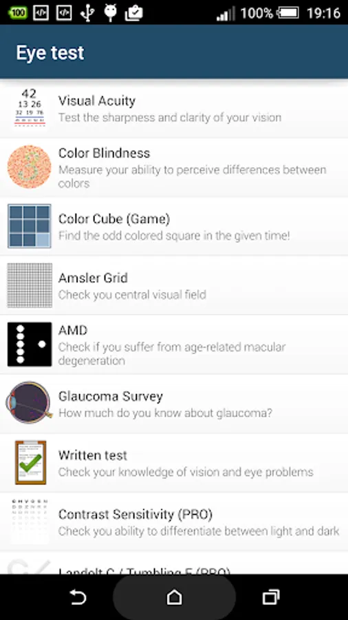 The application has 12 types of eye tests (6 FREE and 6 PRO)