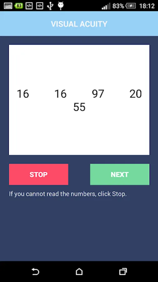 Due to variations in each screen accuracy (screen size, brightness/contrast, resolution) the eye tests are not perfect. Holding a phone of approx 4" screen size 30 cm/12 inches from your eyes would give you nearly accurate results. Hold it (place it) 52cm/20inches from your eyes if you have e.g. a 7" tablet.