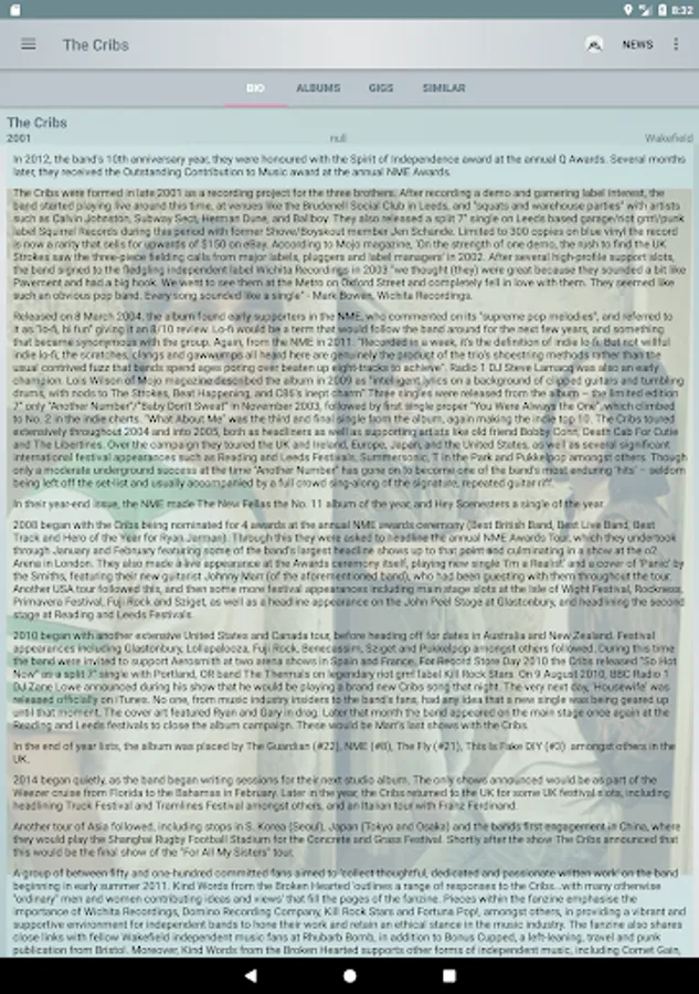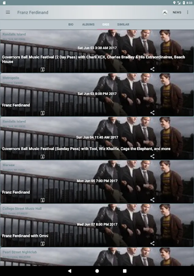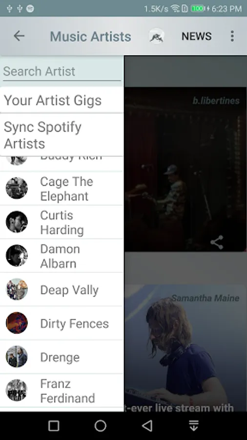 That's the information available for each artist: Biography, Discography, album open in Spotify, Events and ticket, Related Artists, sync artist from Spotify