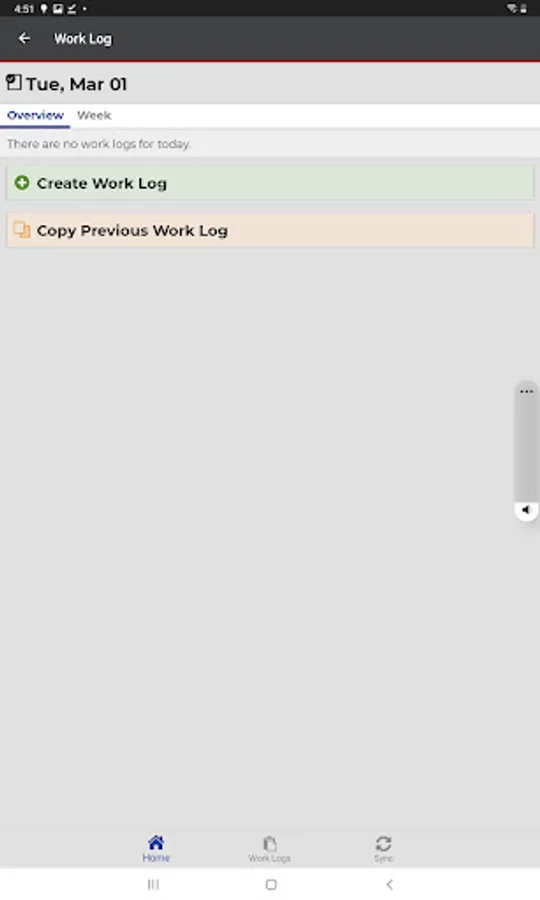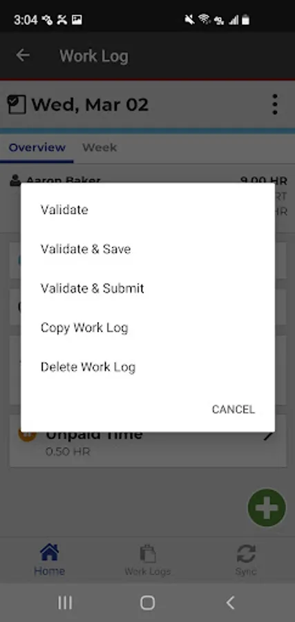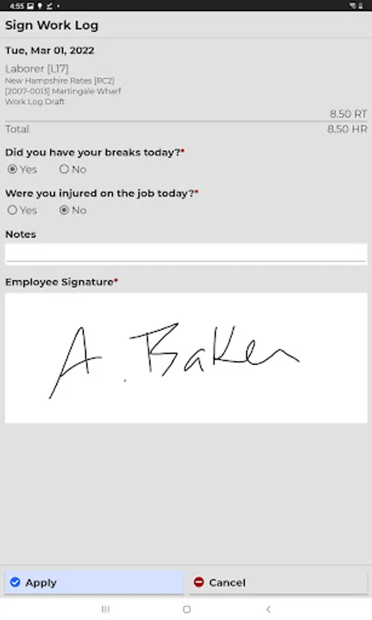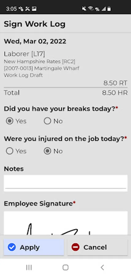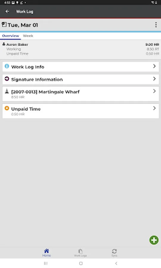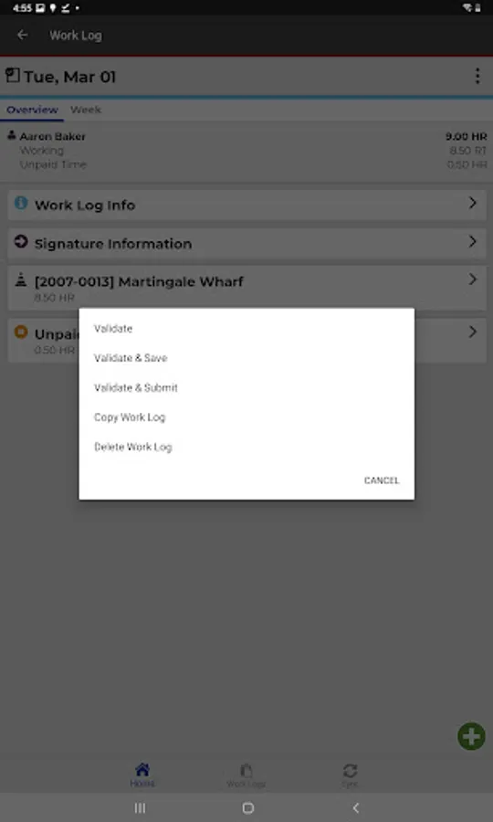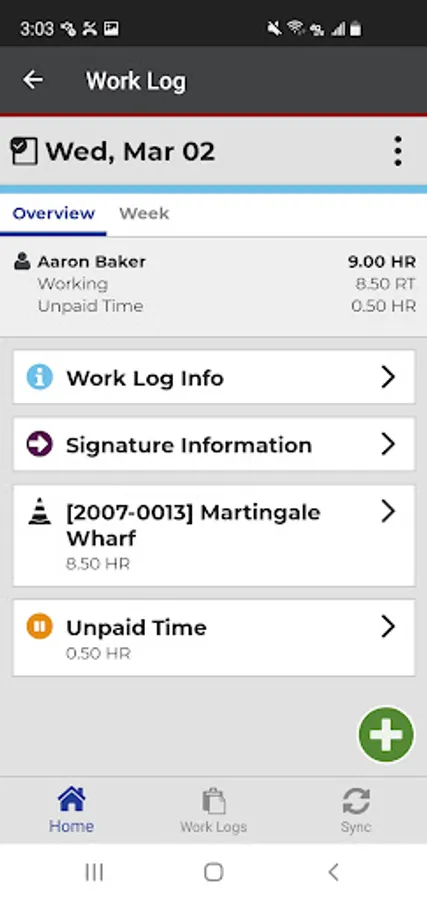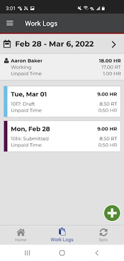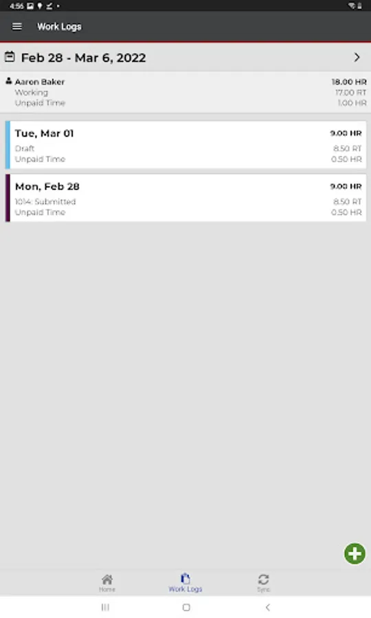 Employees create daily work logs for tracking time and work activities, and can use the app in a real-time, online mode or create and modify work logs offline and send them to a server when a connection is available.