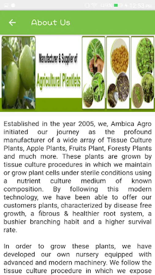 Established in the year 2005, we, Ambica Agro initiated our journey as the profound manufacturer of a wide array of Tissue Culture Plants, Apple Plants, Fruits Plant, Forestry Plants and much more. These plants are grown by tissue culture procedures in which we maintain or grow plant cells under sterile conditions using a nutrient culture medium of the known composition. By following this modern technology, we have been able to offer our customers plants, characterized by disease free growth, a fibrous & healthier root system, a bushier branching habit and a higher survival rate.