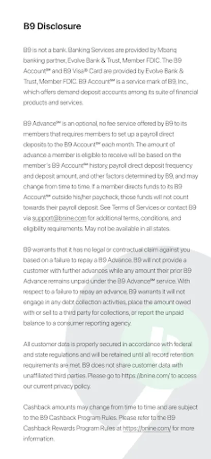 B9 is not a bank. Banking Services are provided by Mbanq banking partner, Evolve Bank & Trust, Member FDIC. Bank account funds are FDIC insured up to $250,000 through Evolve Bank & Trust, Member FDIC. We use PCI-DSS to encrypt all your info. B9 is not affiliated with financial loan, banking, money or cash apps, including Credit Karma, Kikoff Credit Builder Loan, Credit One, Credit Strong, Albert, Earnin, Dave Bank, Chime, Cleo, Klover, MoneyLion, FloatMe, Empower, Cash Now App, Venmo, Self, Possible Finance, or Brigit.