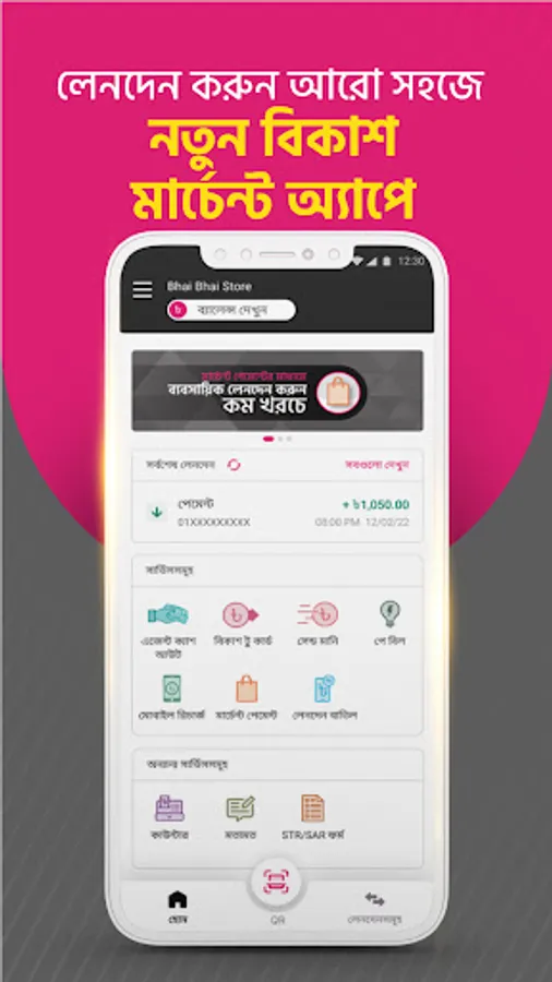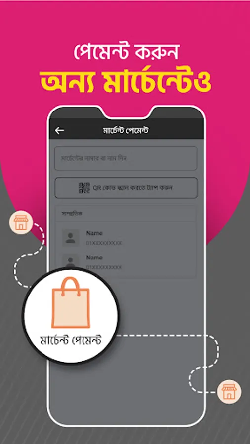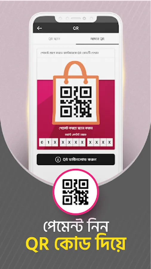 অ্যাপ থেকে যেকোনো বিকাশ গ্রাহককে আপনার মার্চেন্ট QR কোডটি দেখিয়ে বা ডাউনলোড করে যেকোনো সময়, যেকোনো স্থানে পেমেন্ট গ্রহণ করুন।