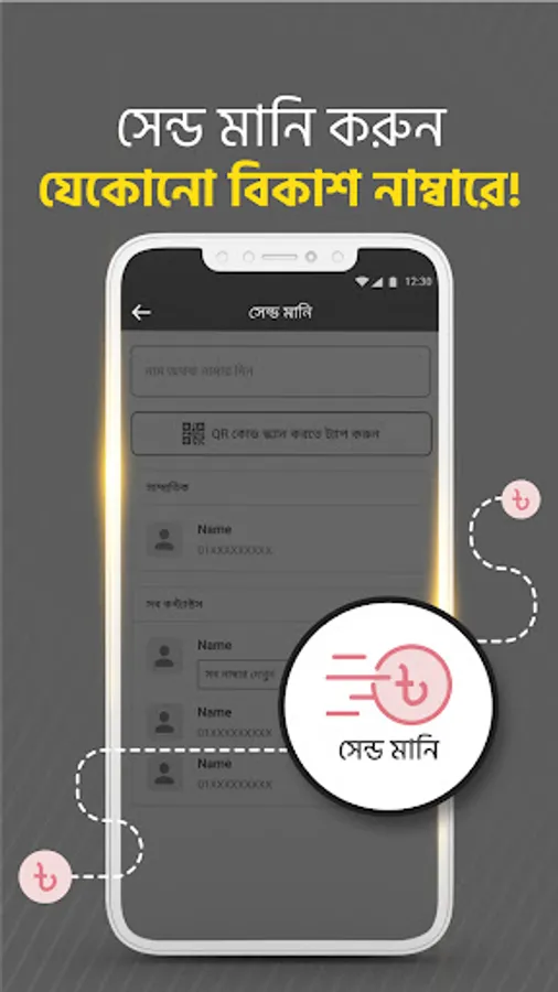 গ্রাহকের QR কোড স্ক্যান করে বা গ্রাহকের একাউন্ট নাম্বার টাইপ করে মুহূর্তেই অন্য বিকাশ গ্রাহককে সেন্ড মানি করতে পারবেন।