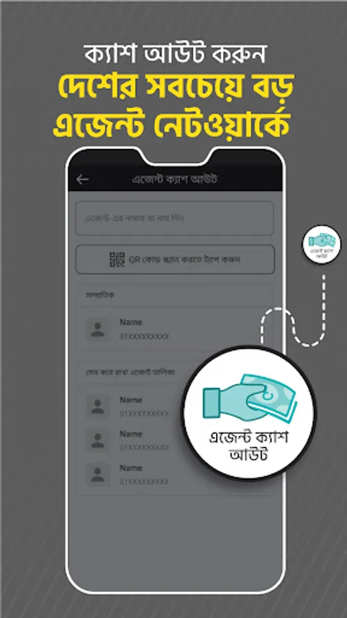 এজেন্ট QR কোড স্ক্যান করে বা এজেন্ট নাম্বার টাইপ করে সরাসরি এজেন্ট পয়েন্ট থেকে ক্যাশ আউট করতে পারবেন।