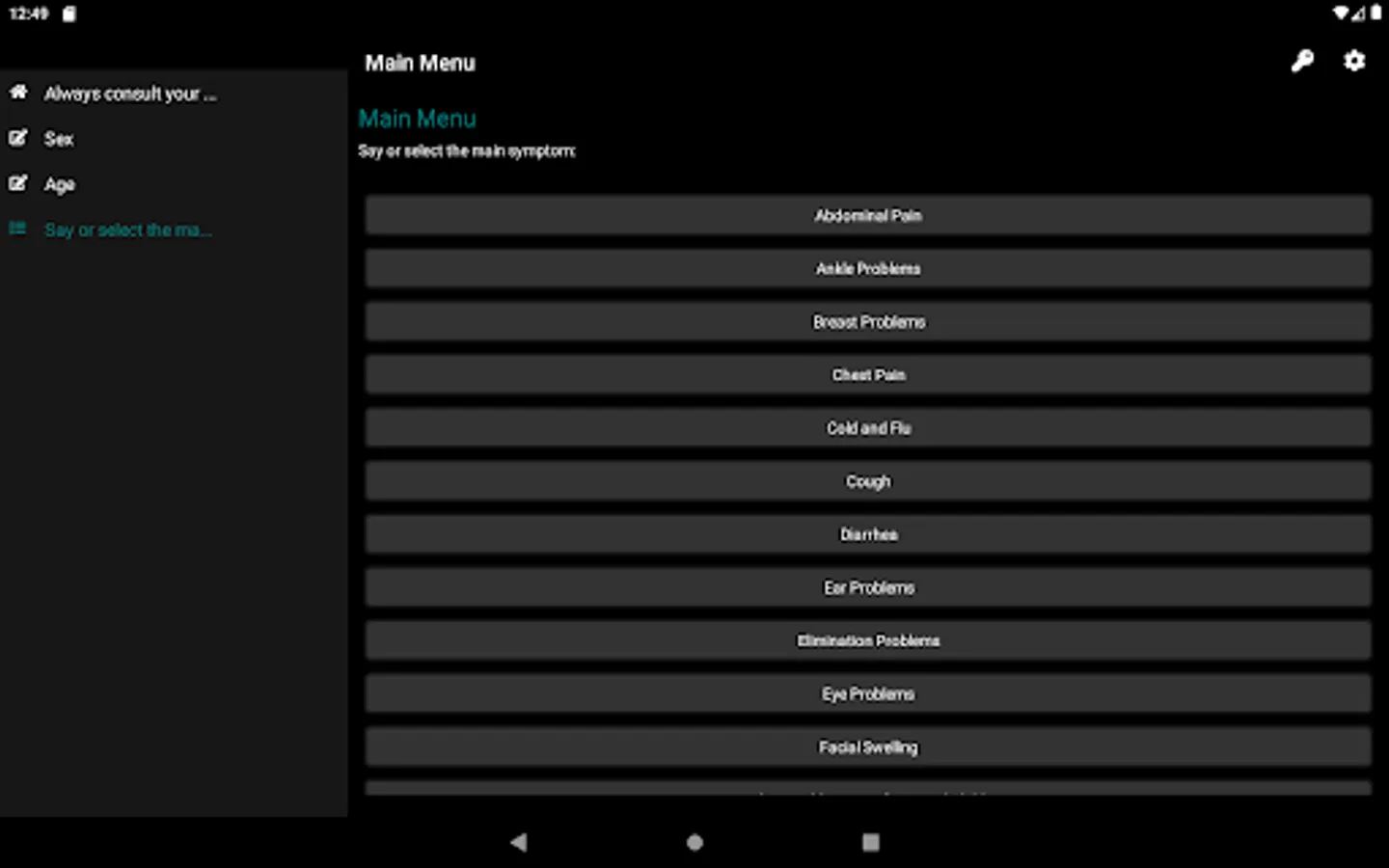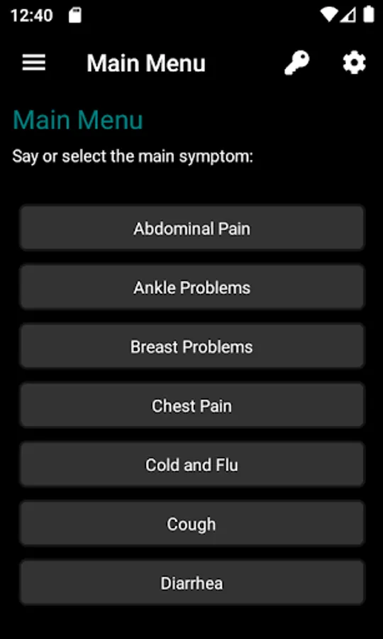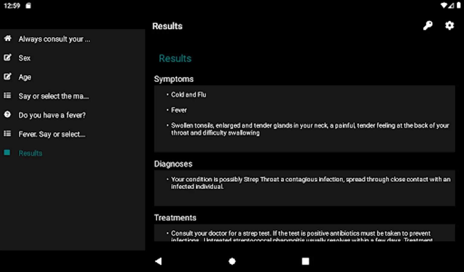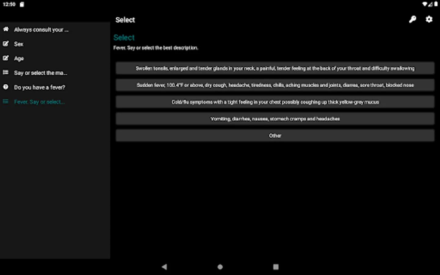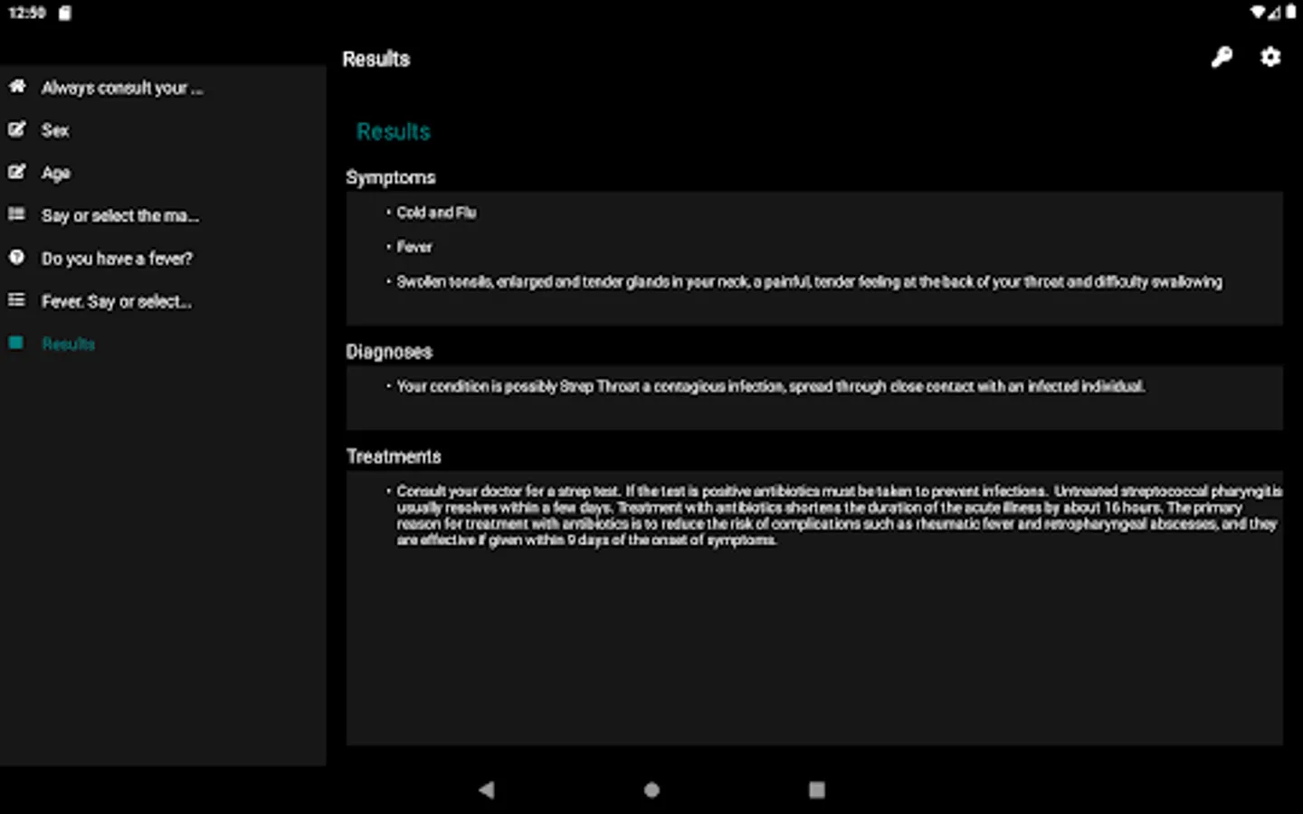 CheckMySymptoms guides the user through a symptom collection survey. The result after the survey is a listing of possible diagnoses and treatment options. The user can make selections using voice commands. A narrator guides the user through every screen. The narrator can be turned off or modulated on the settings screen.