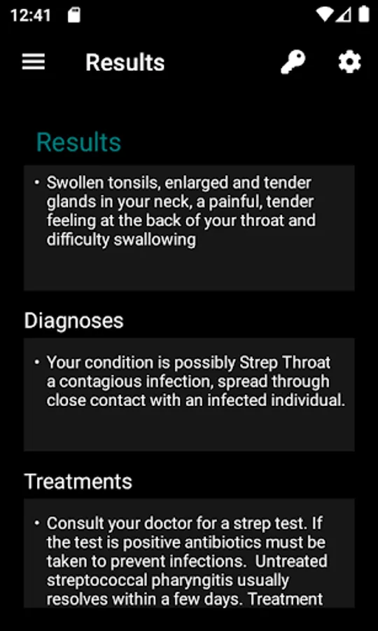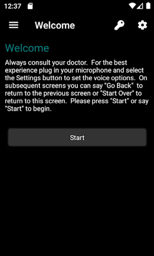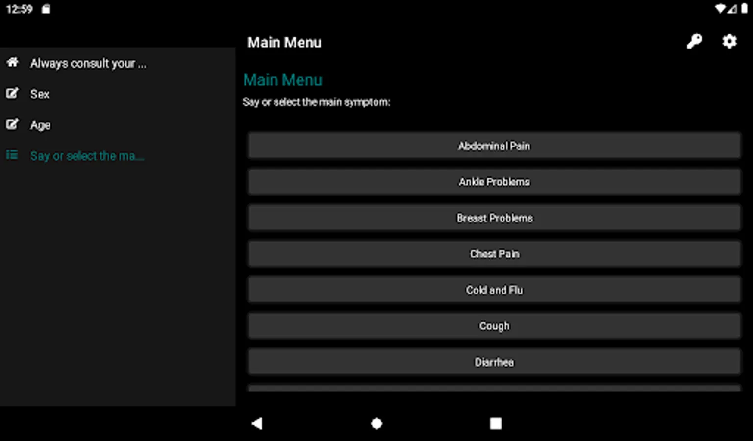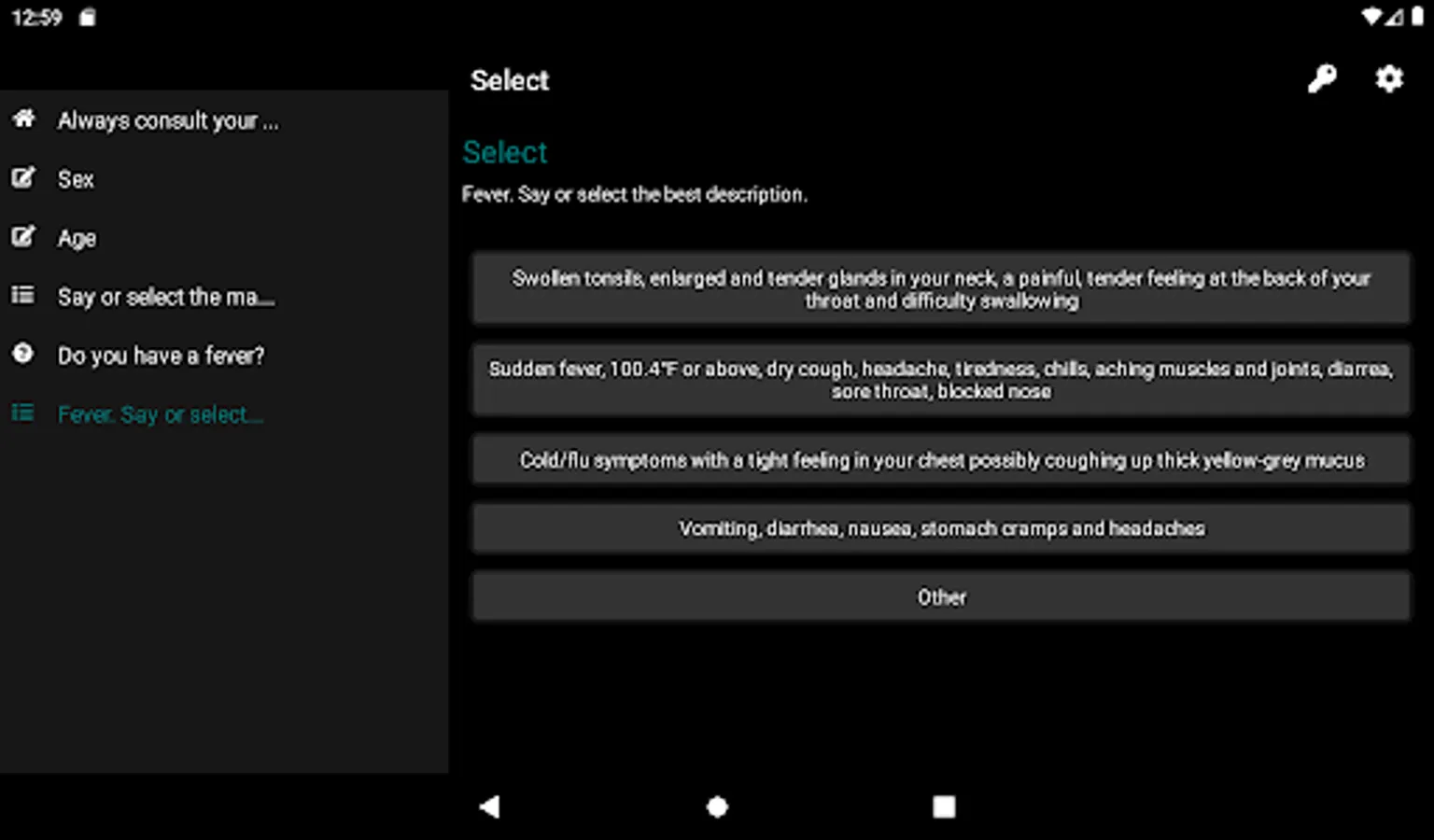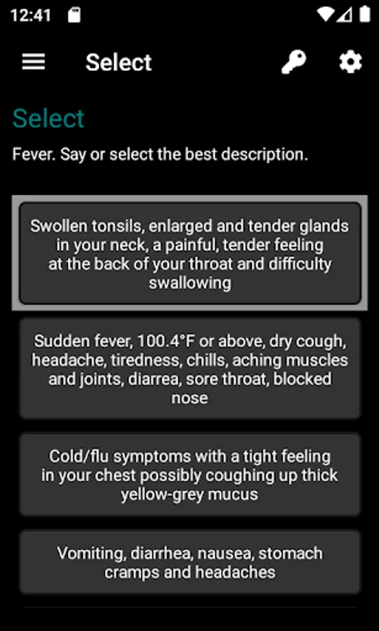 CheckMySymptoms guides the user through a symptom collection survey. The result after the survey is a listing of possible diagnoses and treatment options. The user can make selections using voice commands. A narrator guides the user through every screen. The narrator can be turned off or modulated on the settings screen.