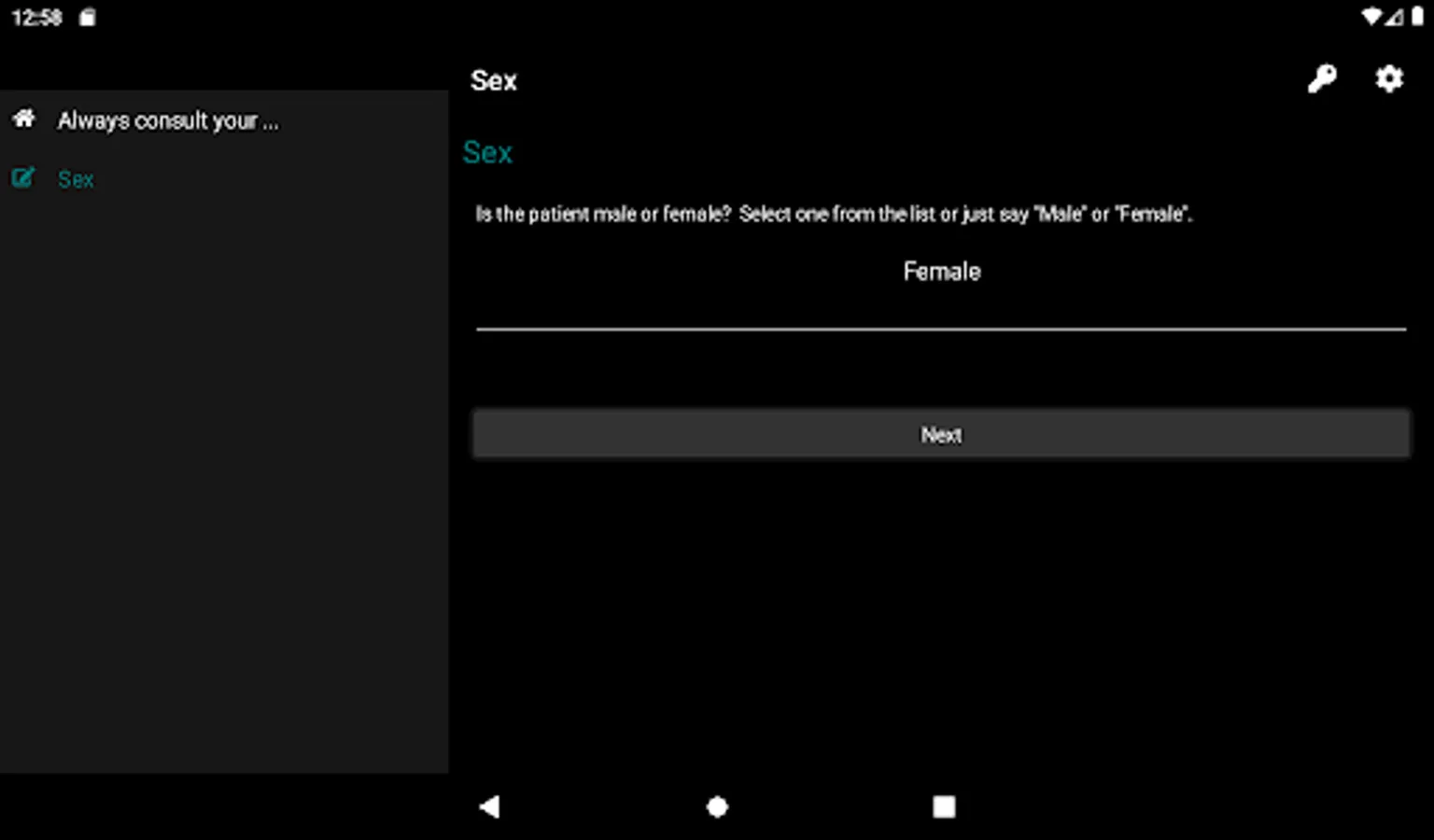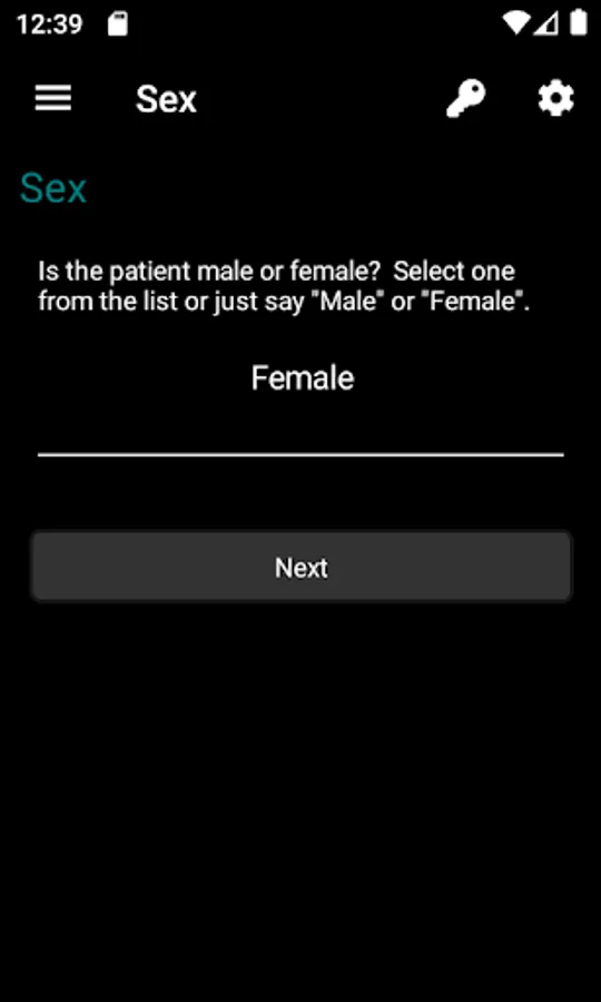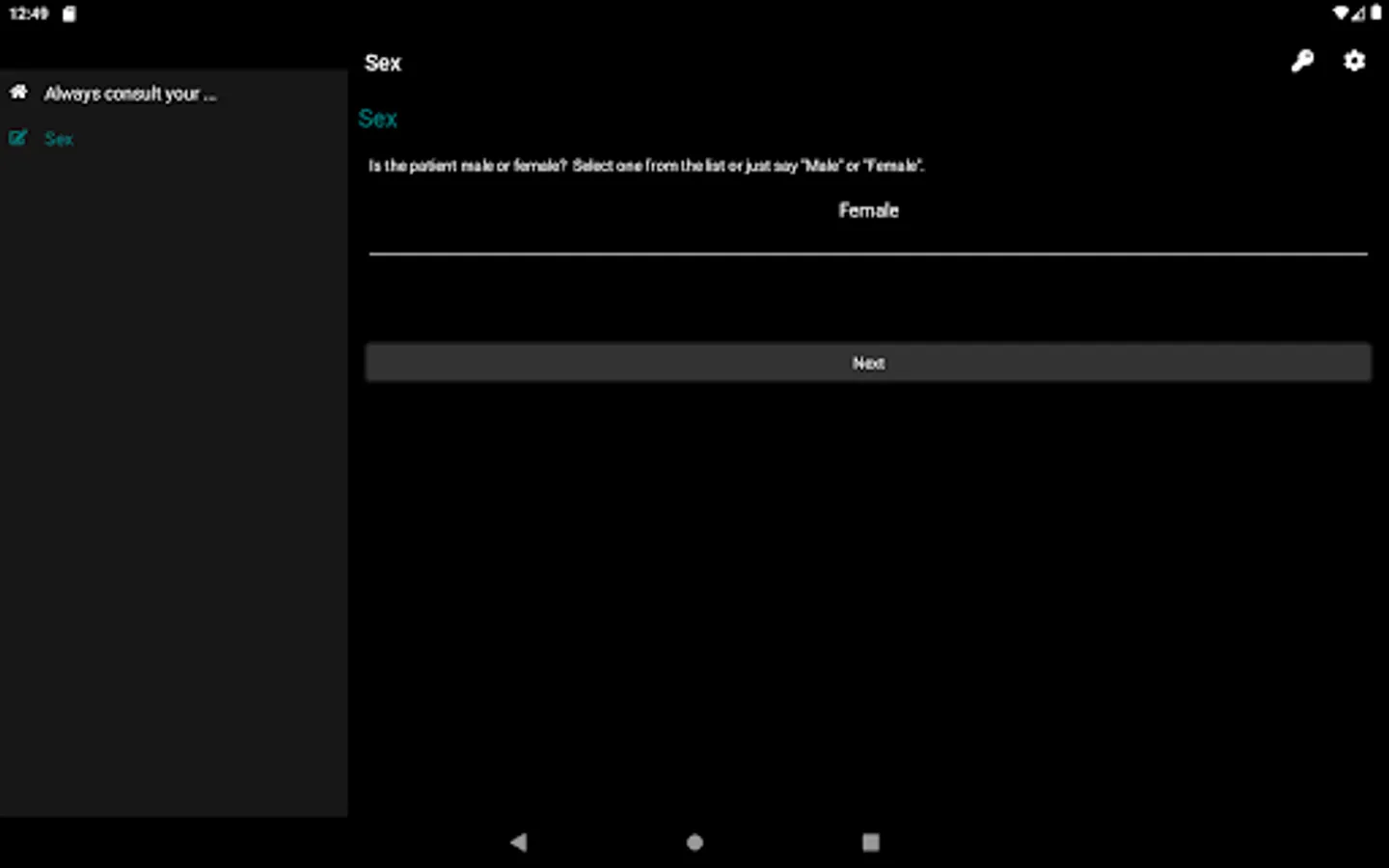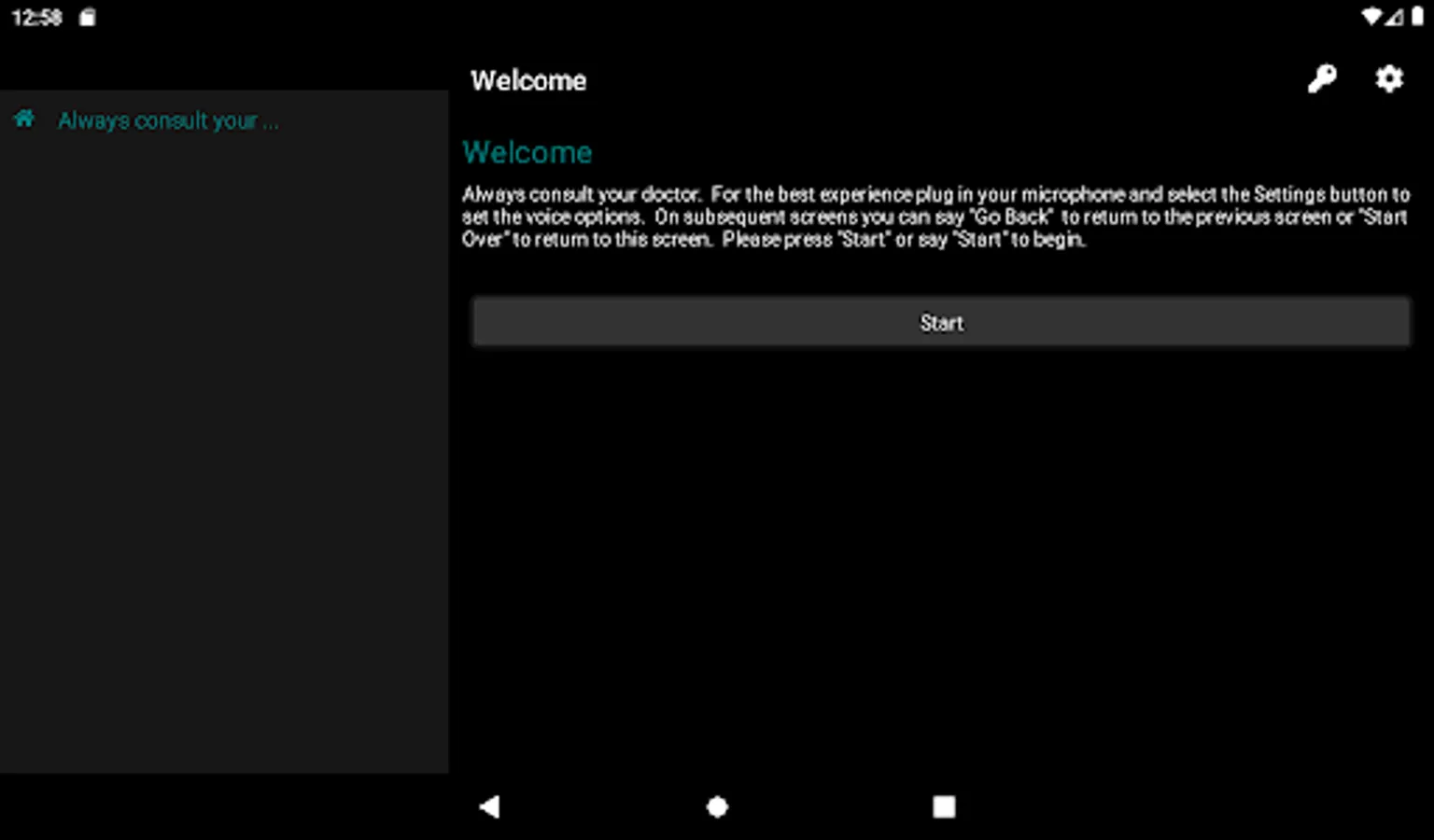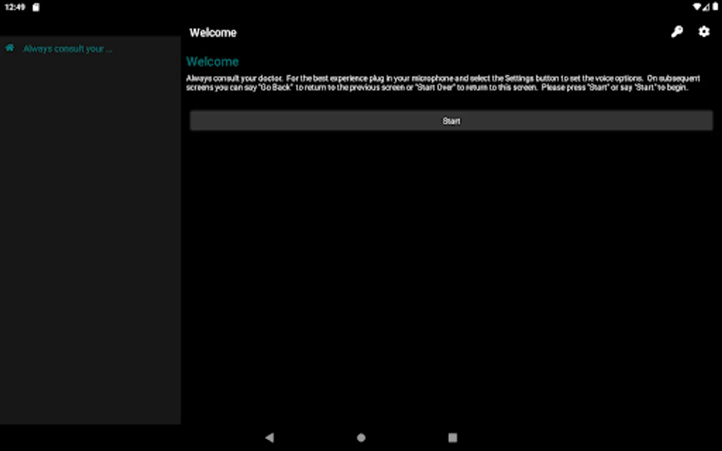 CheckMySymptoms guides the user through a symptom collection survey. The result after the survey is a listing of possible diagnoses and treatment options. The user can make selections using voice commands. A narrator guides the user through every screen. The narrator can be turned off or modulated on the settings screen.