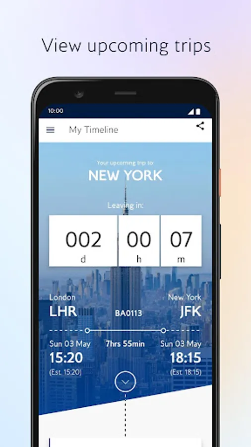 Your home screen is your personal gateway into the BA app. Themed around your next destination, it will give you easy access to important information surrounding your flight, including your mobile boarding pass.
