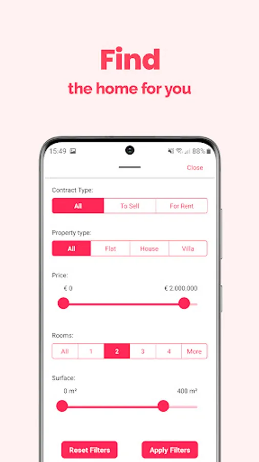 - Map based search: No more ads or pop-ups while searching a home. Insert place or point location to have your property search