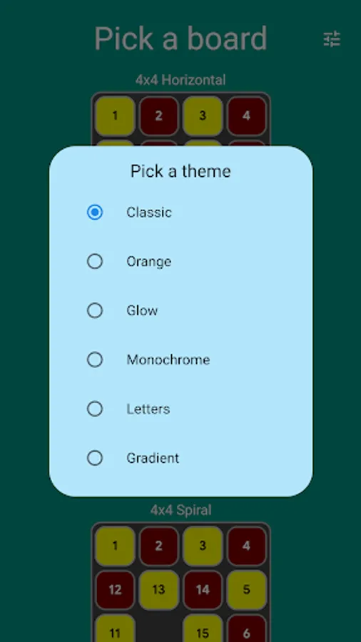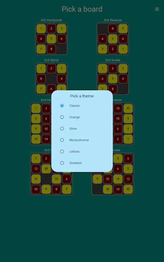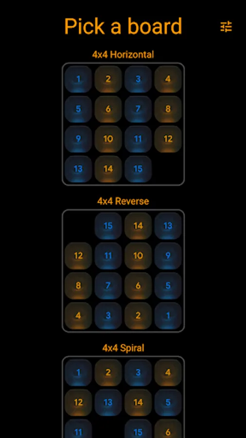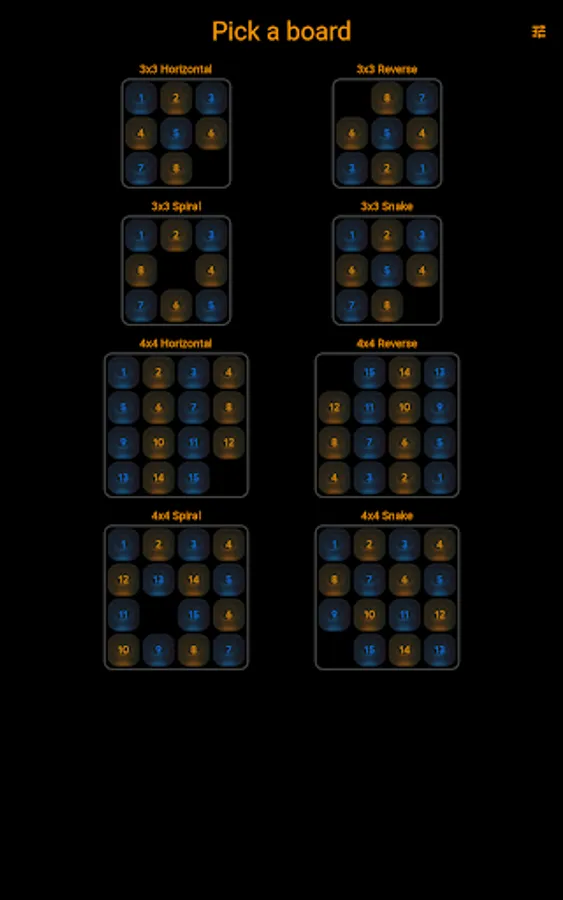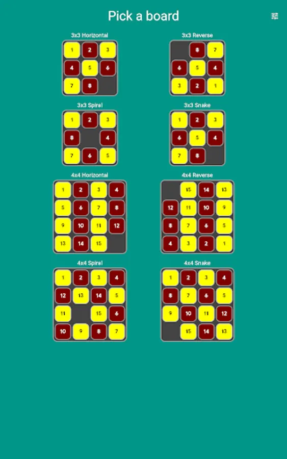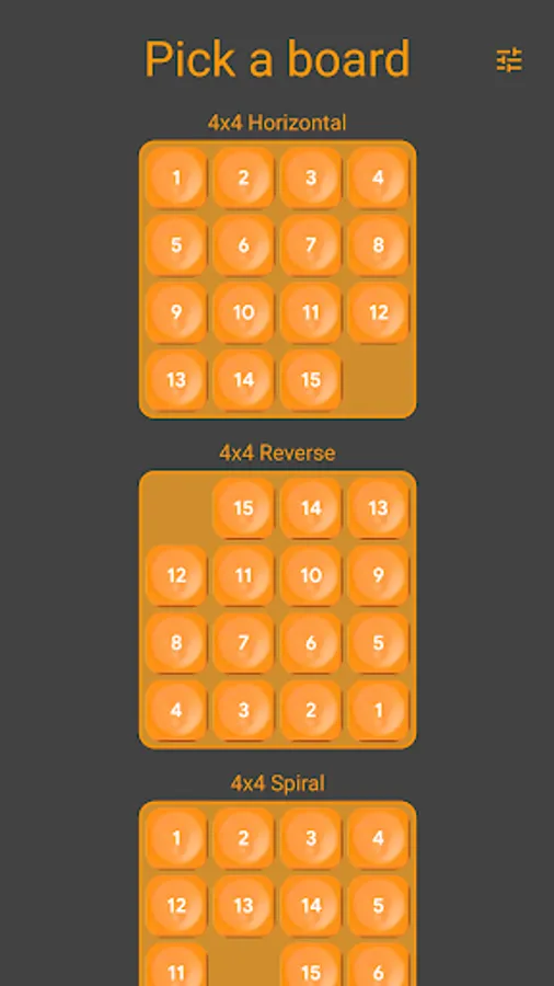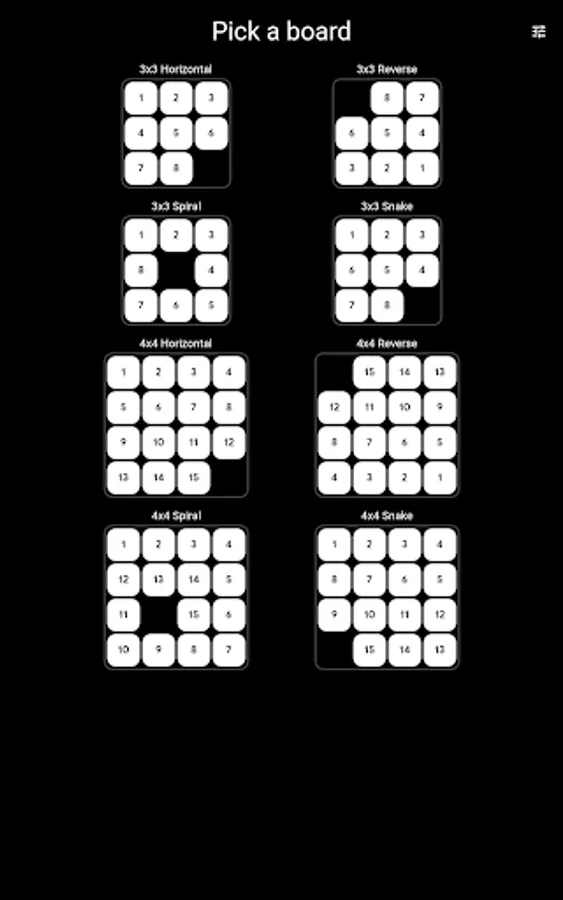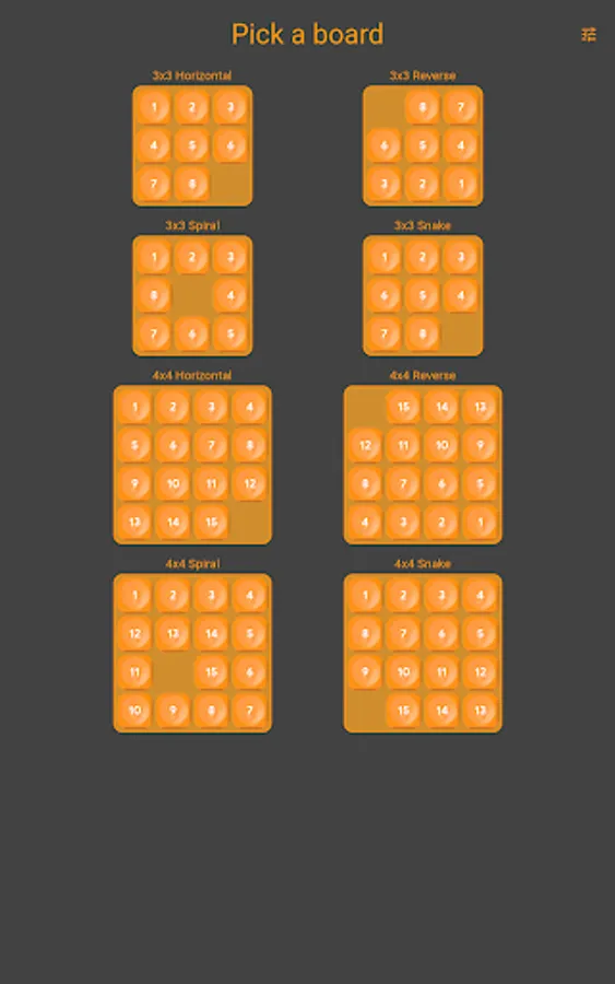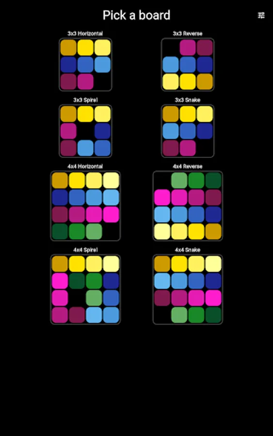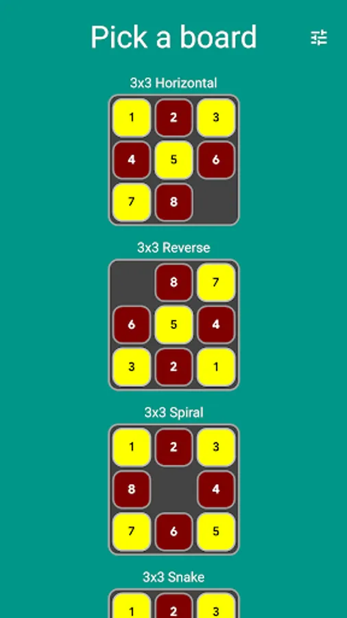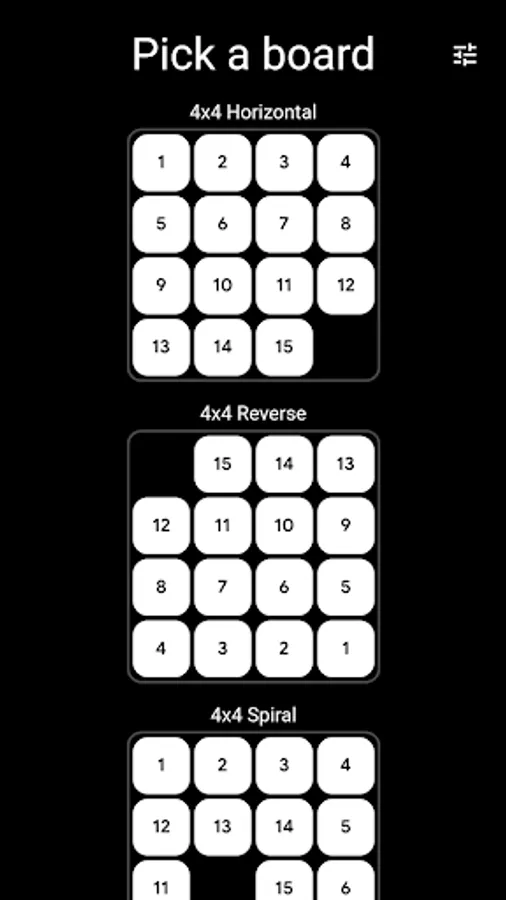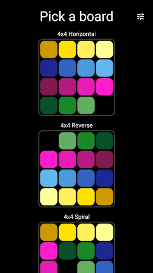 Pick your board and solve the puzzle in the least number of moves. Or just use Auto Play and enjoy the zen while the computer does the playing for you, using an A* algorithm to get to the solution.