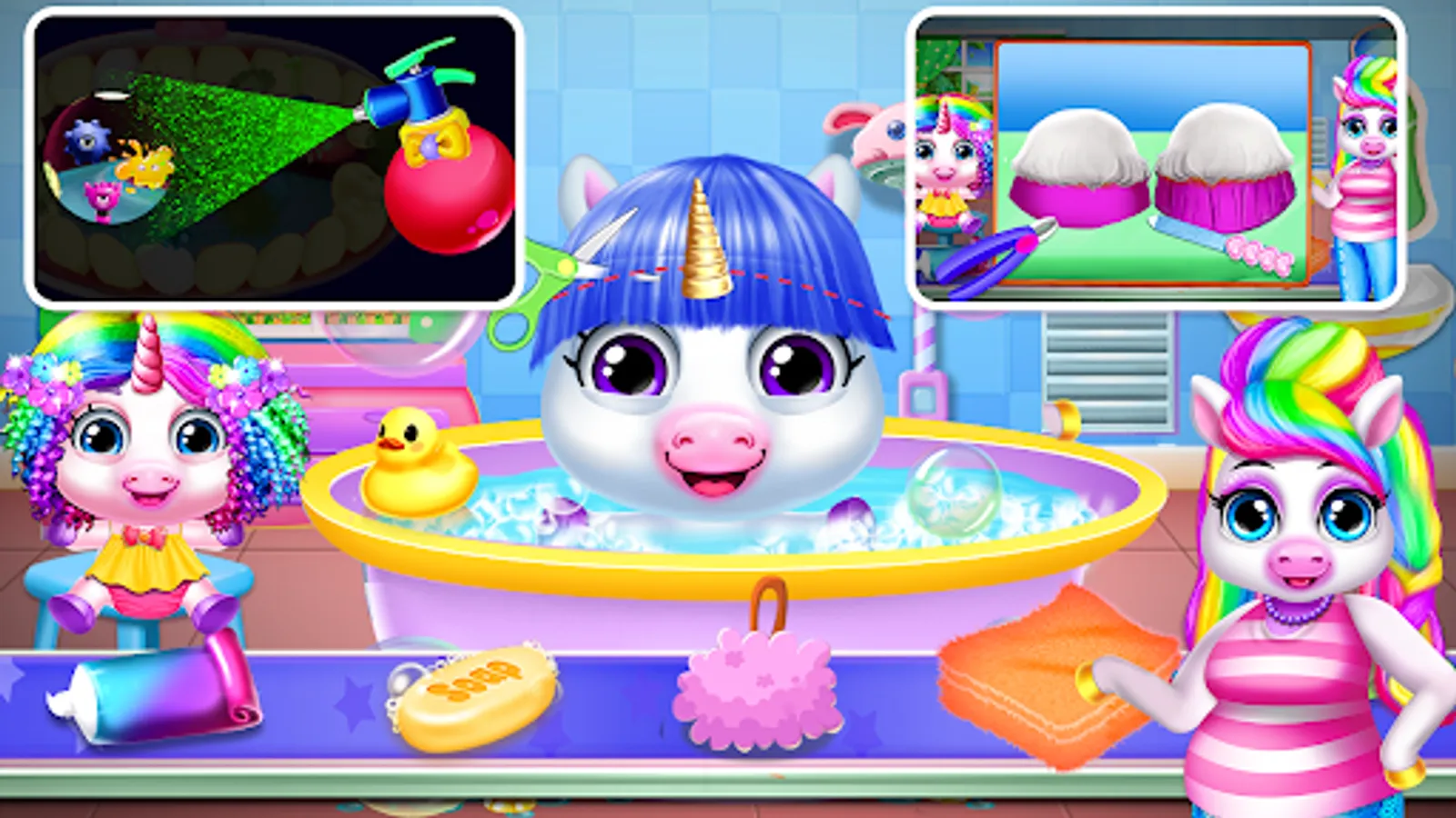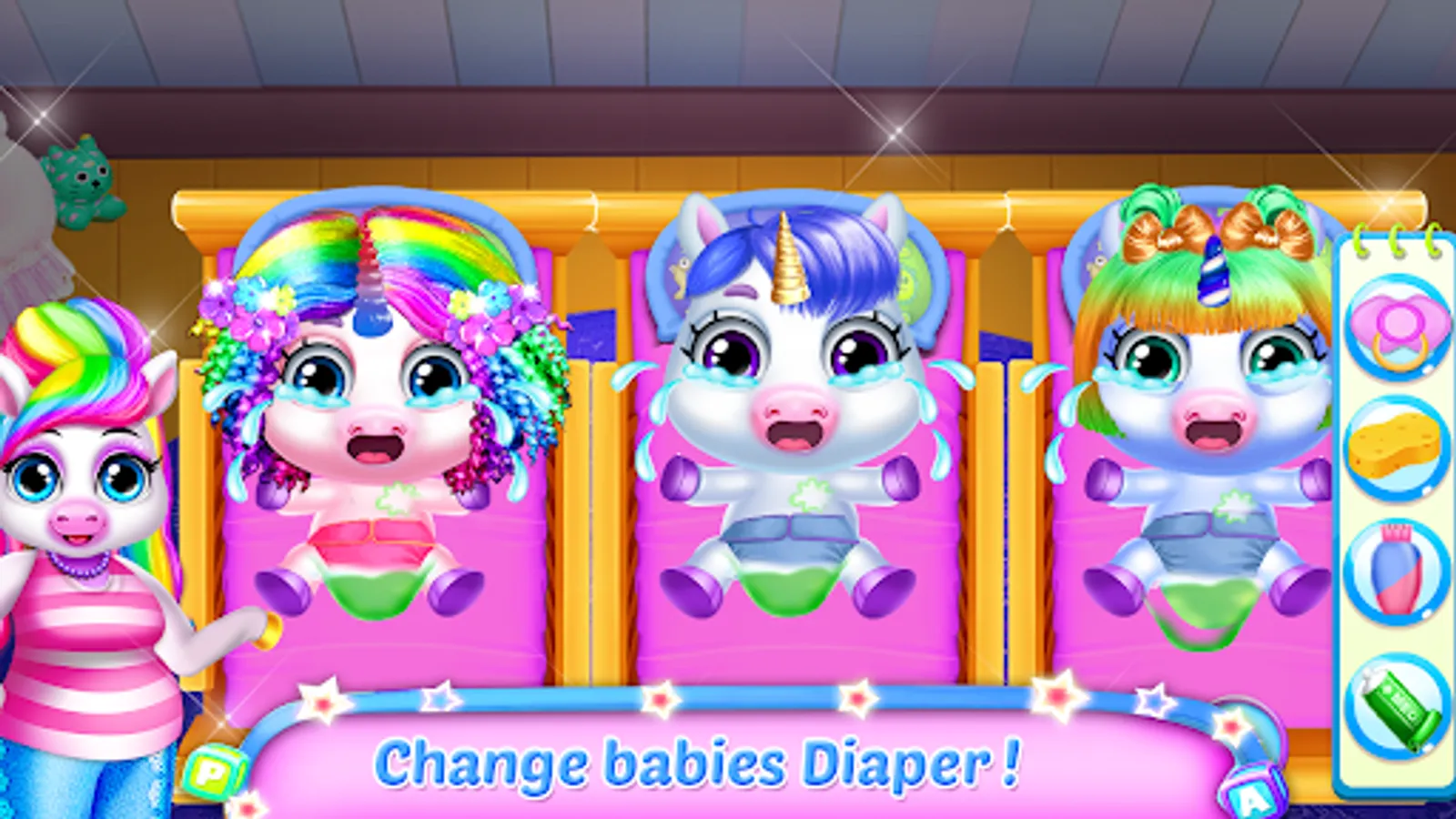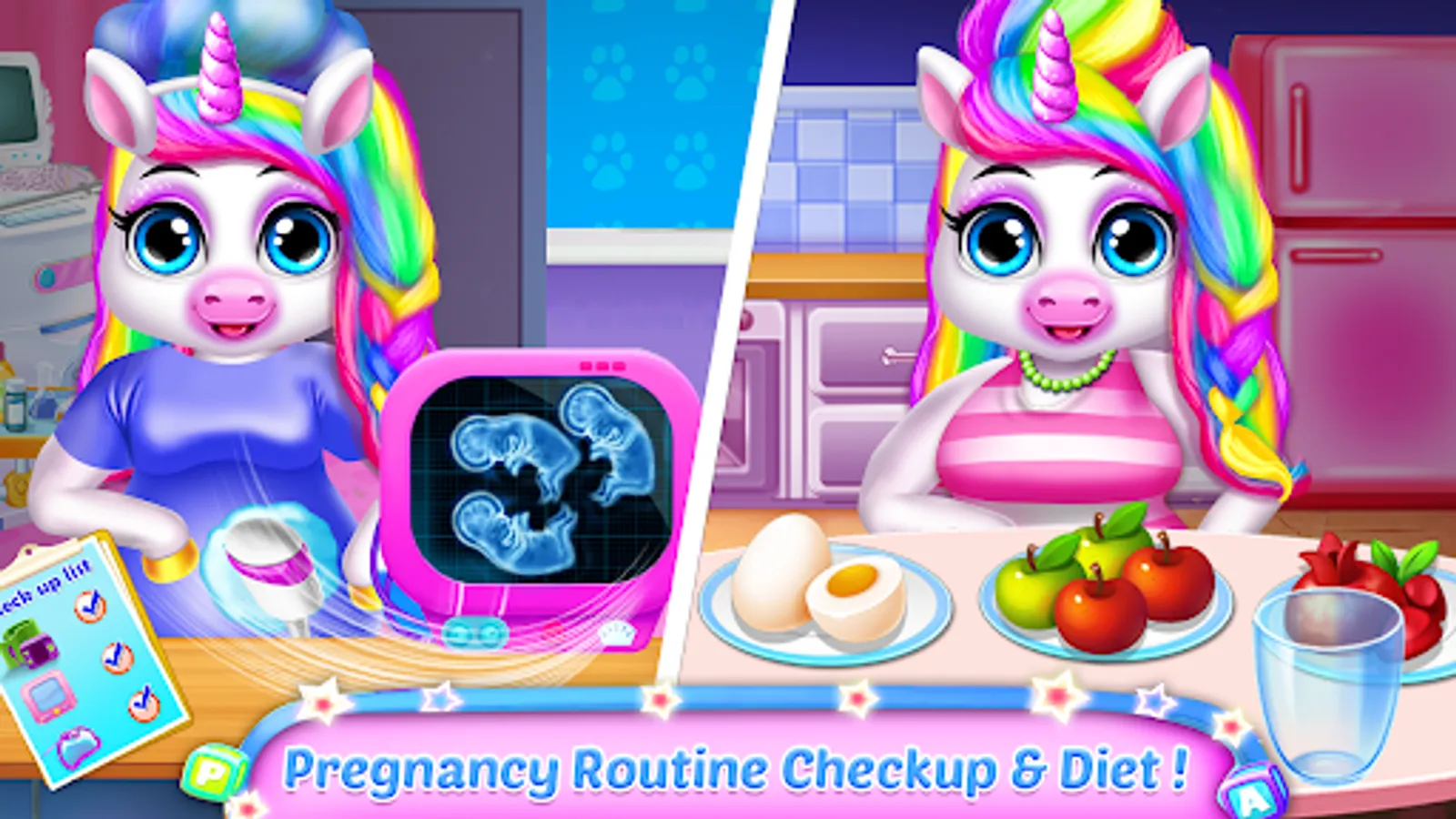 Mommy Pregnancy Unicorn give birth newborn Baby Caregiver and maternity care games for girls. Pregnant teen mom care needs some safety and nutrition to stay healthy throughout nine months before giving birth triplet babies game for kids. Expected girls need healthy mix of foods like complex carbohydrates, protein, vegetables, fruits, grains and healthy fats, vitamins and minerals, folic acid and zinc. Unicorn Regular medical visits and checkups are important in trimester like monitor the healthy baby development for a prenatal checkup includes ultrasounds, oxygen mask, bp checking, heart beat, glucose and diabetes tests in babysitter apps. Educational activities like coloring by numbers, shapes draw and diapers art work. Reservation to a hair dressing salon for your cute newborns to look more cute tycoon in upcoming events.