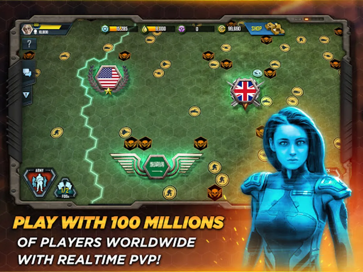 In the arid and merciless lands of World War 3, fight for survival in Real Time Strategy 3D game. Compete in a PVP battle by making strong alliances to weaken your enemies with your cunning politics. Combine military power and deadly weapons to gain advantage and ensure a superior army.
