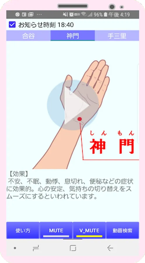 画像、音、振動に合わせて、ツボ刺激をしてみてください。