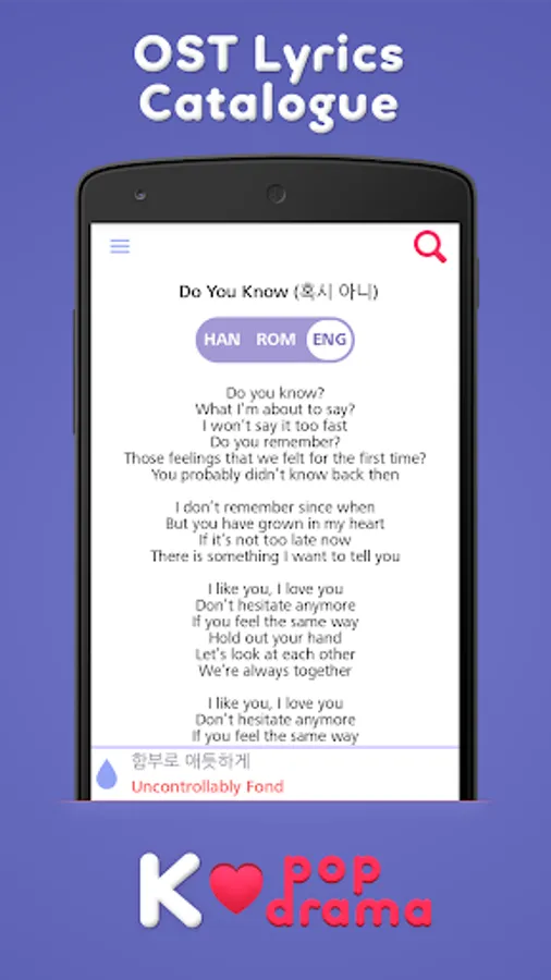 In this application you can find great number of Kpop lyrics in Korean, Chinese, Japanese, Vietnamese and Indonesian. This application does not contain audio or video. It only contains the lyrics, the title and the name of the artist. We have included English translation as well as Romanization. The lyrics are separated into 2 categories - Recent and Most Popular. You can browse songs by singer or groups. There is a search feature, which we are improving constantly.