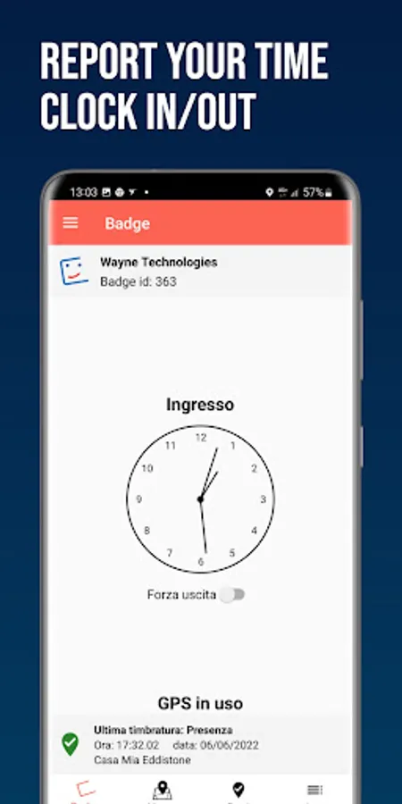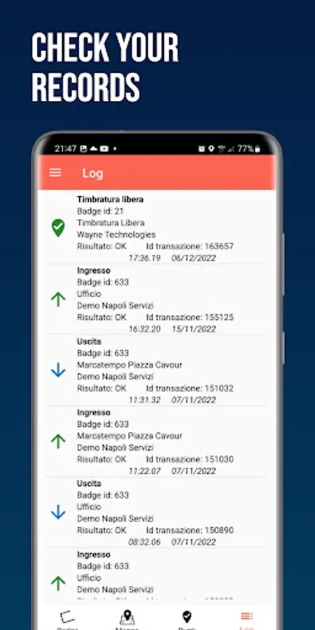 Application has also a map view showing virtual badge points range so to simplify badge actions.