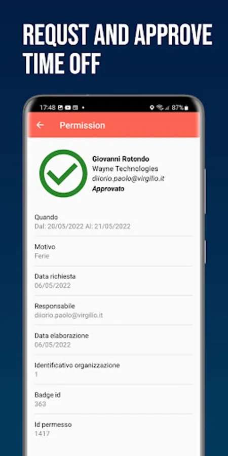 Users can also request through the app days off and permissions. Administrator will get a notification about that and can approve or reject the request through the app.