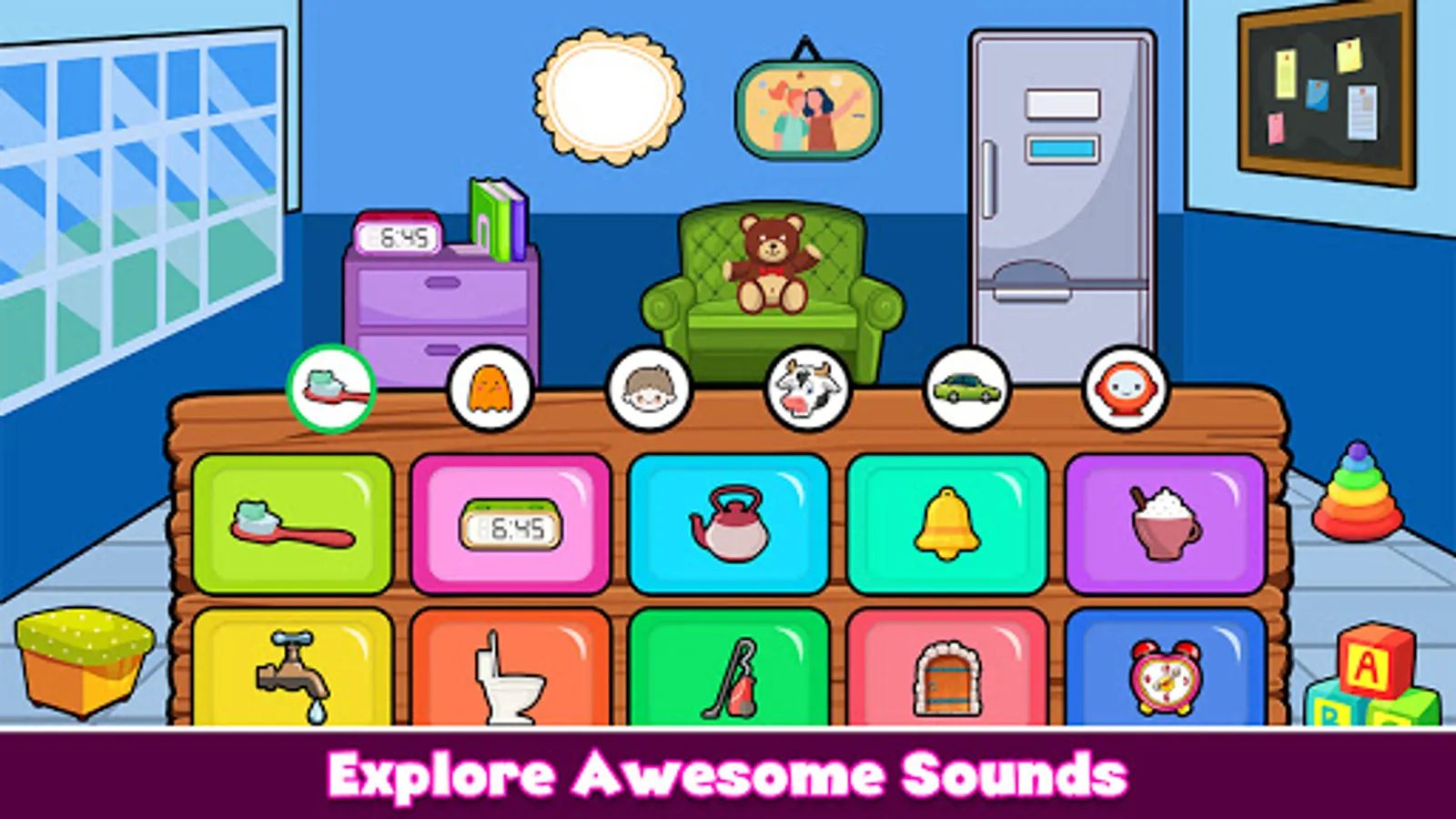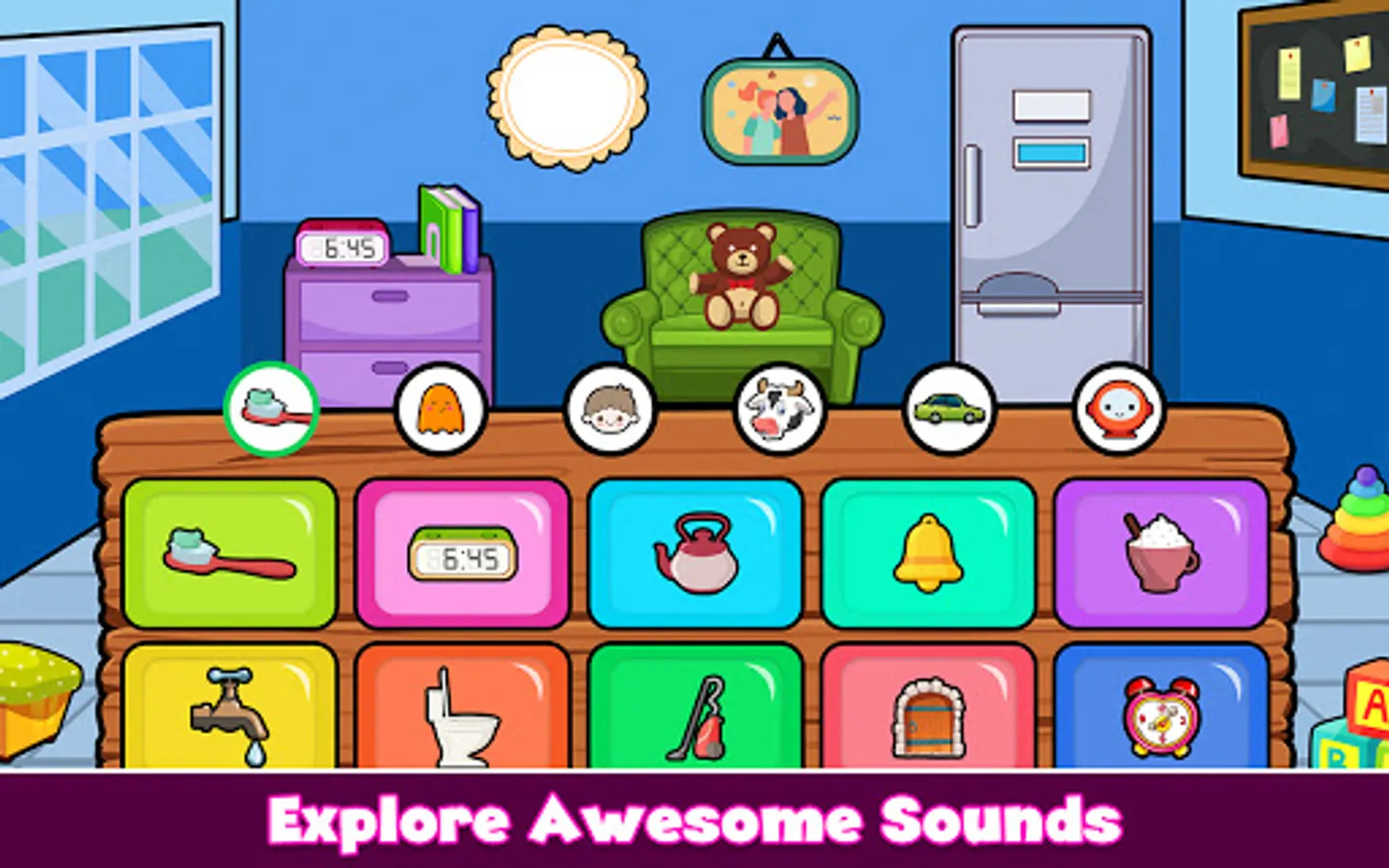 Kids users can play nursery rhymes like Jingle Bells, Happy Birthday, Twinkle Twinkle Little Star, Old MacDonald Had a Farm, Pop Goes the Weasel, The Muffin Man, Wheels on the Bus, & Five Little Monkeys, etc. Baby musical instruments. Children will perform with a number of instruments-piano, drums, bells, flute, guitar, trumpet, harmonica, & tambourine. Great animations with fun characters will guarantee a fantastic experience for children aged 2 to 5. Sounds for Kids. This exciting but also educational activity will encourage your child to learn the sounds of various animals, vehicles, and much more! Baby piano features 60 incredible sounds for children through 6 incredible sets: