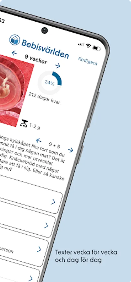 If you are pregnant, you will receive rich and up-to-date information about the fetus, mother and father every week during the pregnancy. In addition, you receive daily texts that provide inspiration and reflection.
