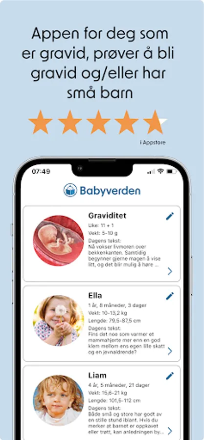 The app follows you from the time you want to become pregnant, through pregnancy and until the child is 3 years old. New texts every day! Chat and get to know your test, period or maternity group on the forum!