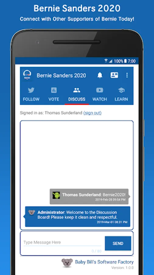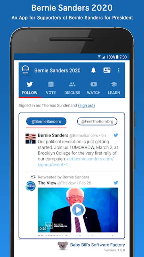 The Bernie Sanders 2020 app is for people who support Bernie Sanders for President in the 2020 election to come together and be heard.