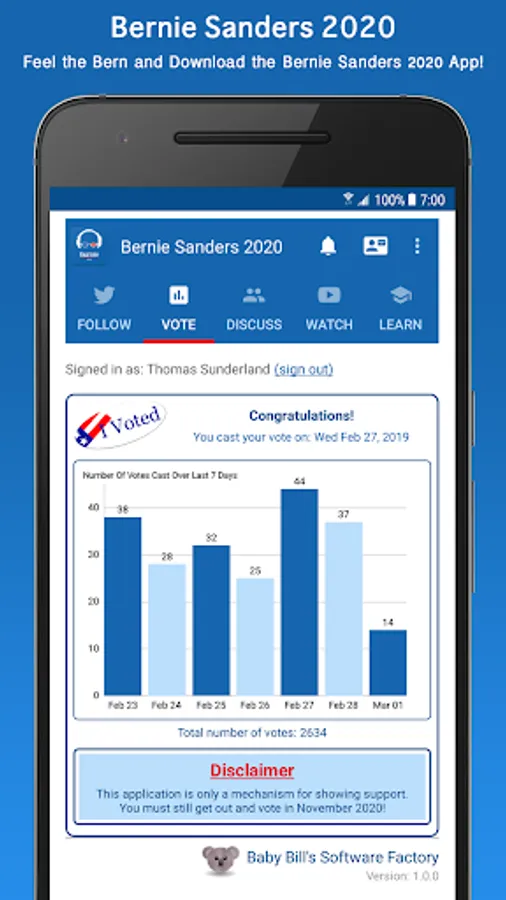 The "Vote" feature allows you to declare that you stand with Bernie. This feature also graphs how many others have votes within the app in the last 7 days and shows you the total number of people who have cast a vote within the app.