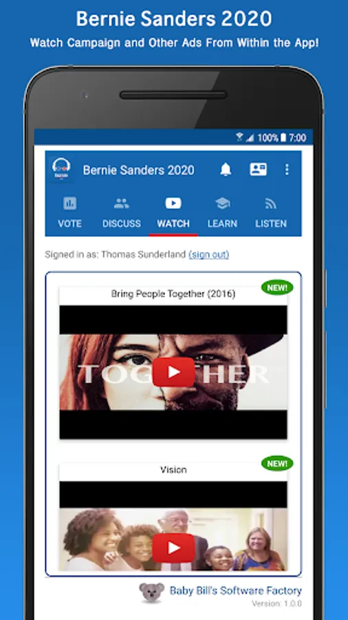 The "Watch" feature allows the user to watch Bernie related video content such as campaign ads and other videos.